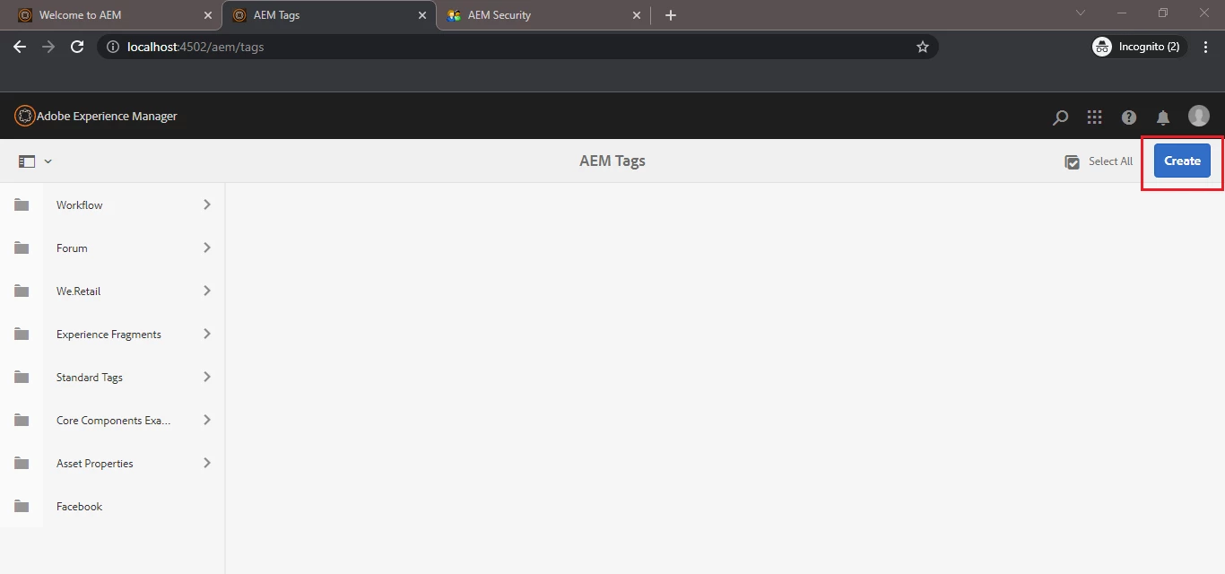 - From the Start screen (http://localhost:4502/aem/start.html), navigate to Tools -> General -> Tagging - Notice that Create button is visible on load of Tagging screen. (http://localhost:4502/aem/tags).