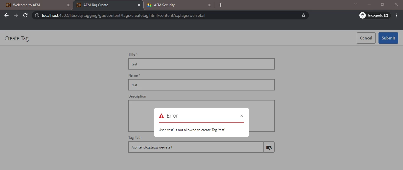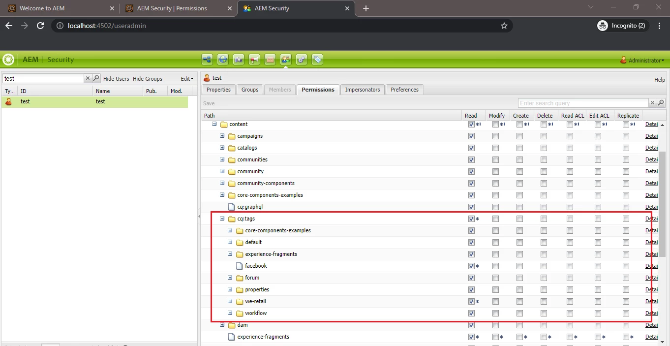 - On a vanilla 6.5.16 AEM instance, create an user who has only read permissions under /content/cq:tags, and read permissions on root path - /