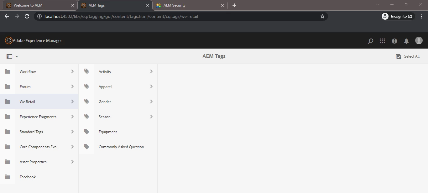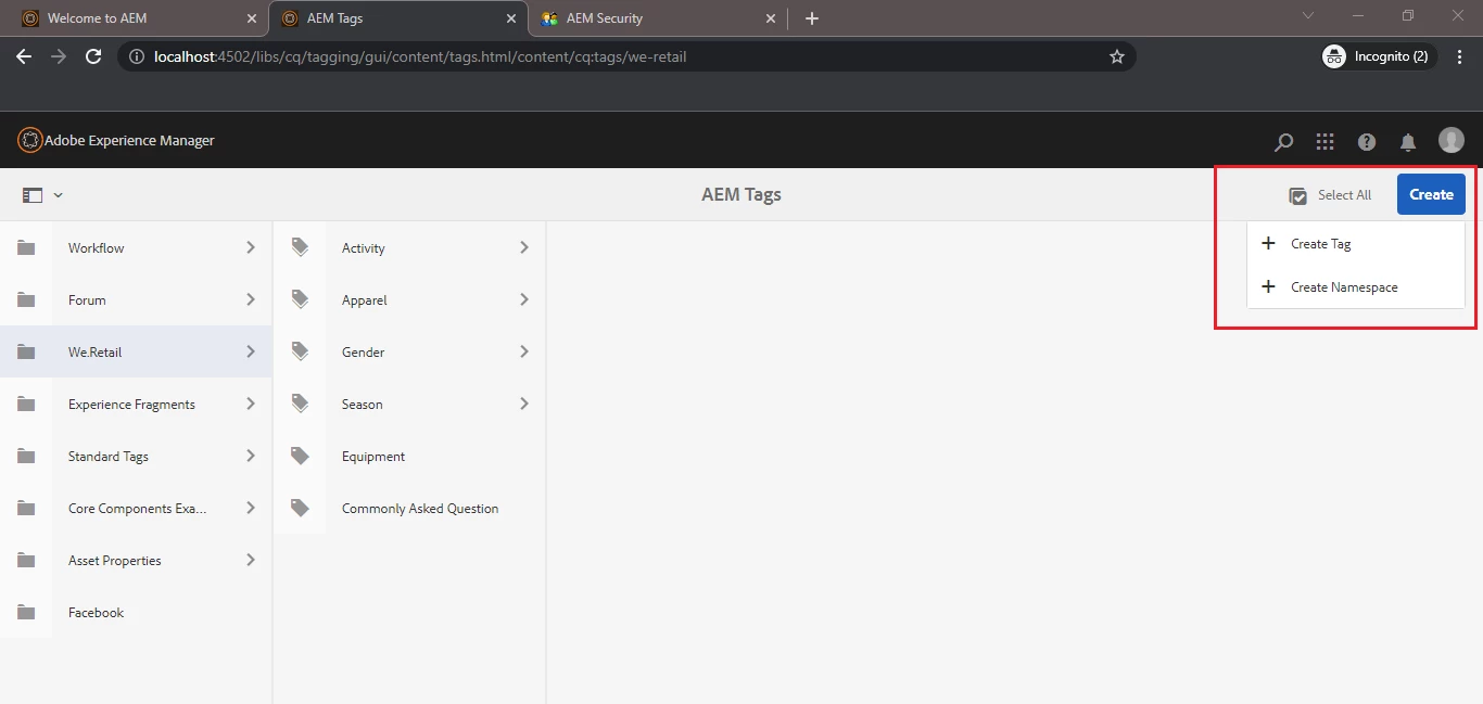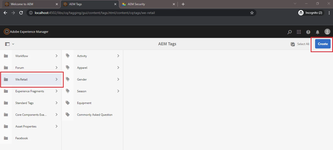 - Click on any of the child tags, say We.Retail. Create button is still visible.
