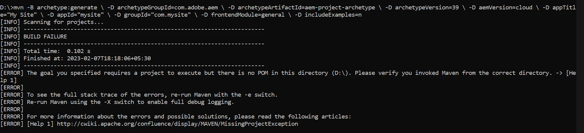 Command Used: mvn -B archetype:generate \ -D archetypeGroupId=com.adobe.aem \ -D archetypeArtifactId=aem-project-archetype \ -D archetypeVersion=39 \ -D aemVersion=cloud \ -D appTitle="My Site" \ -D appId="mysite" \ -D groupId="com.mysite" \ -D frontendModule=general \ -D includeExamples=n