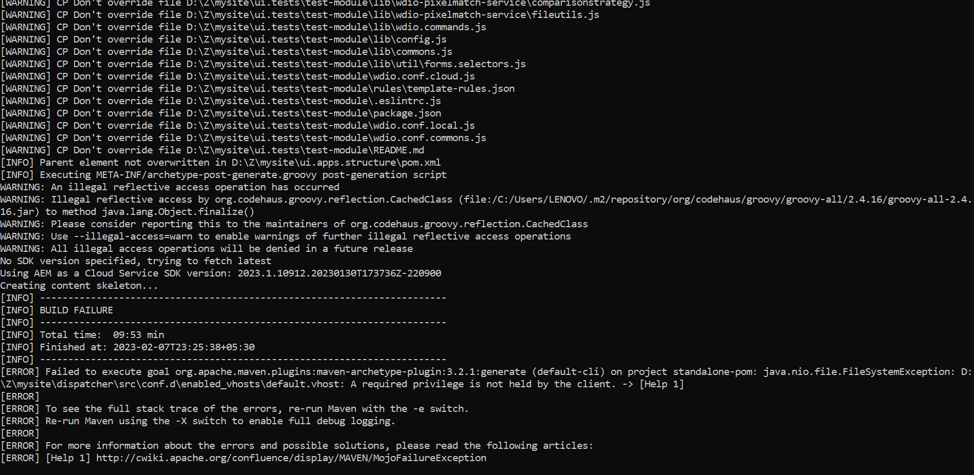 When trying to create an AEM project using archetype 39, it shows build failure.