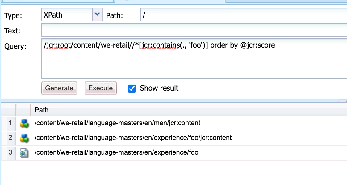 I am trying to run a query against any node inside the path I specify, returning any nodes that contain any property containing the string 'foo'. To do so, I use this query suggested by CRXDE Lite: