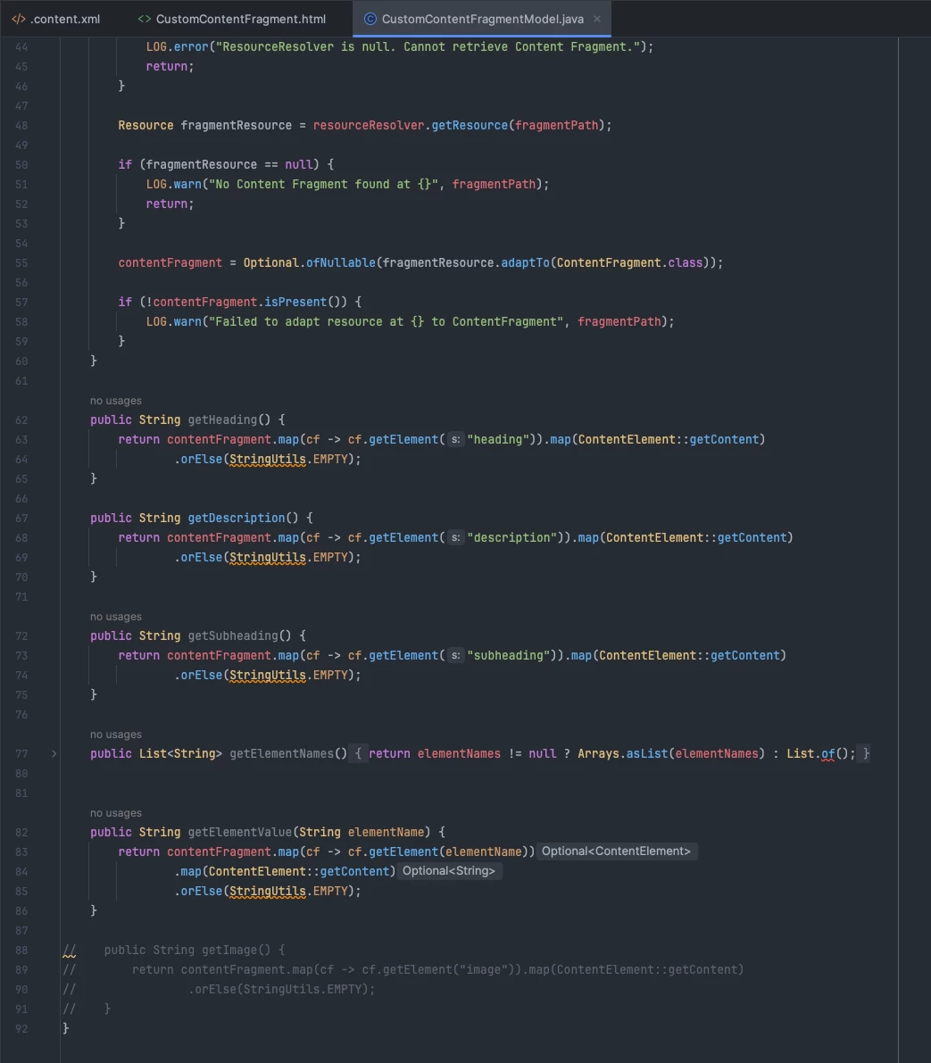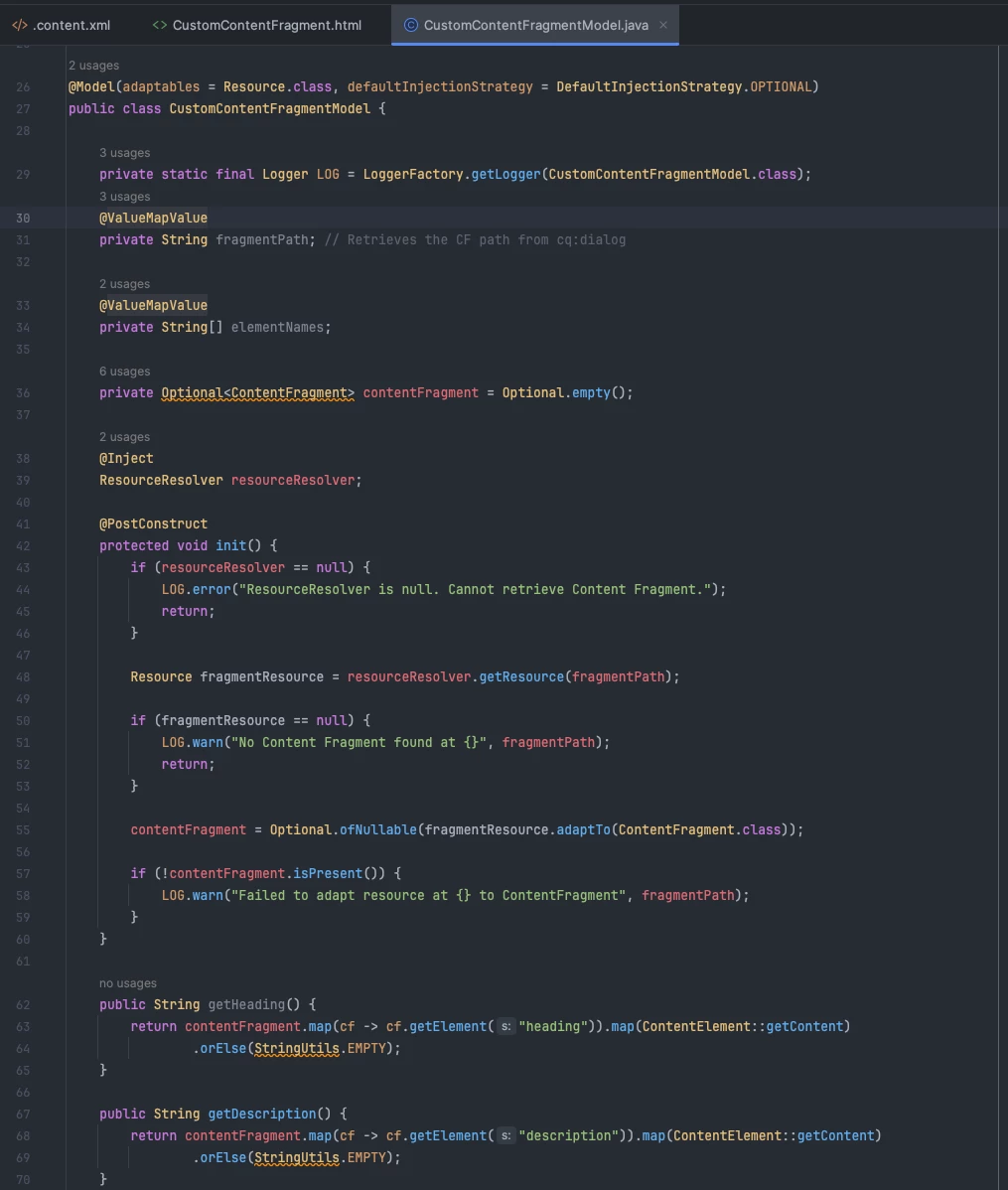- For nested content fragments, I would like to find the content fragment, grab it's data and expose it to the component's HTL