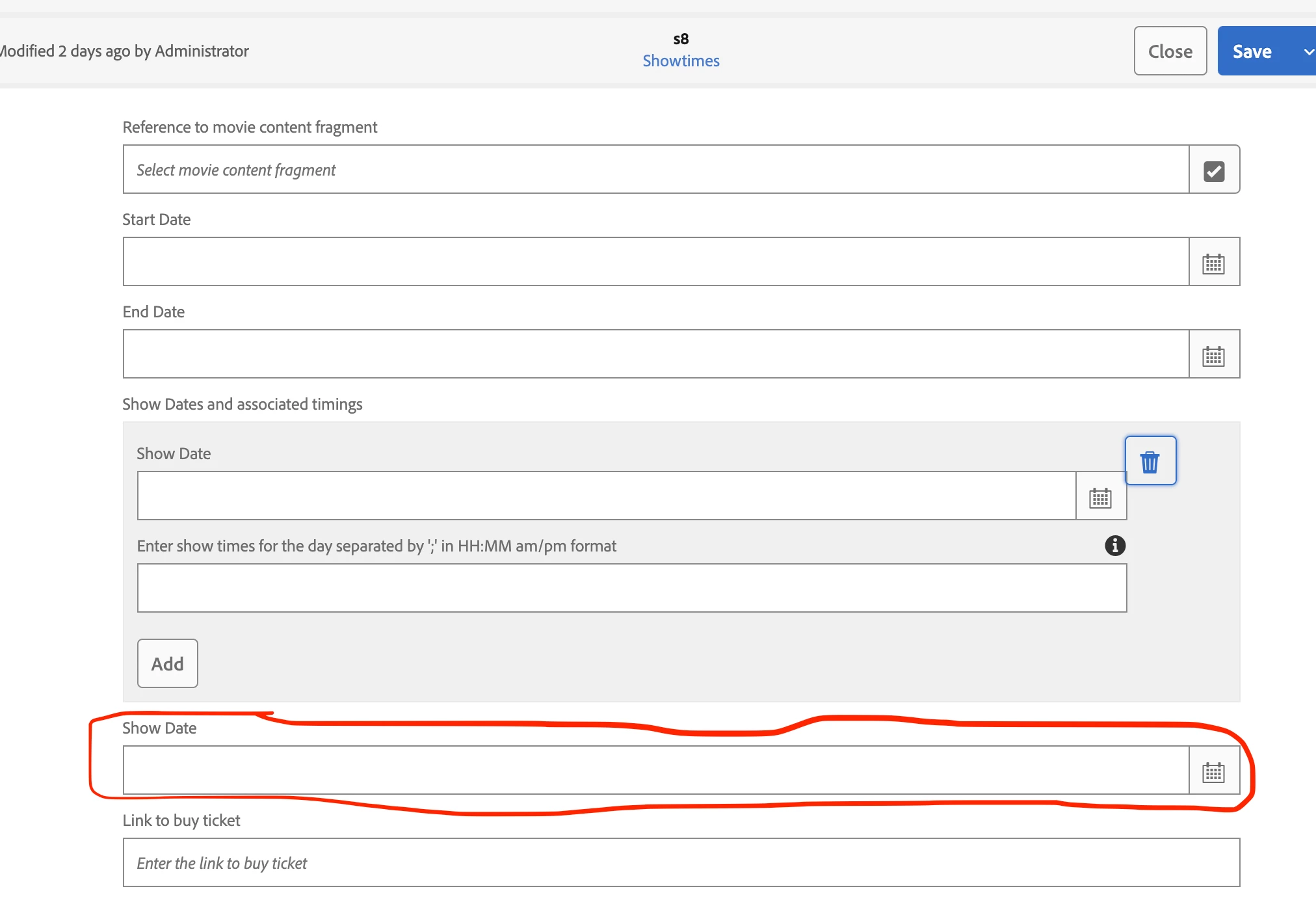 emptyText="Enter show dates and associated timings"