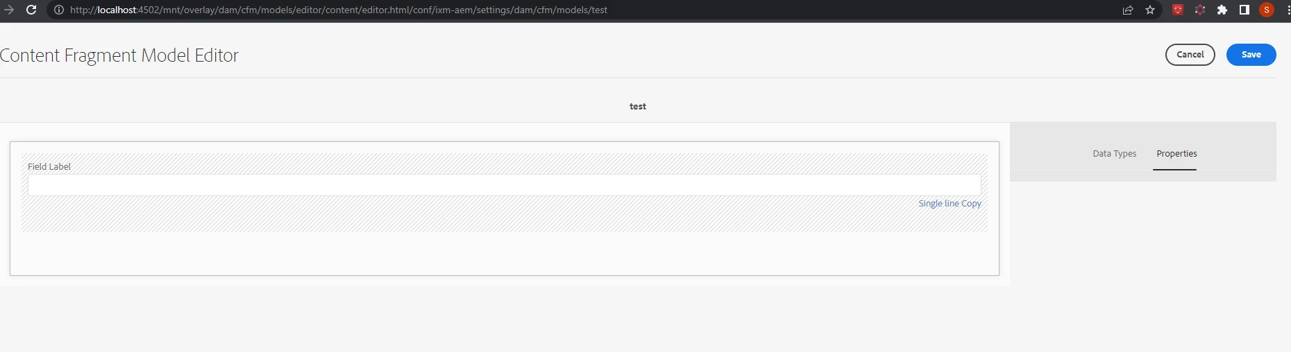 I tried with creating the copy of the "/libs/settings/dam/cfm/models/formbuilderconfig/datatypes/items/text-single" with bare minimum changes, but for that also the properties appear blank as shown in the screenshot.