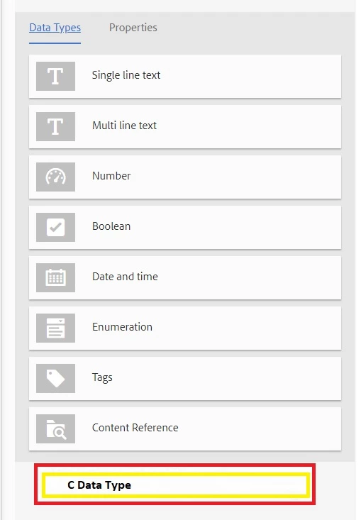 3. Use the Sling Resource Merger mechanism to add your custominput component under the datatypes node. Add the new node, /apps/settings/dam/cfm/models/formbuilderconfig/datatypes/custominput with configurations like (making sure that you take an existing content fragment data type component as inspiration and as an example for your own configuration, so you understand the structure of how to component is setup; also lets you understand the requirements to how you can create your own datatype component.