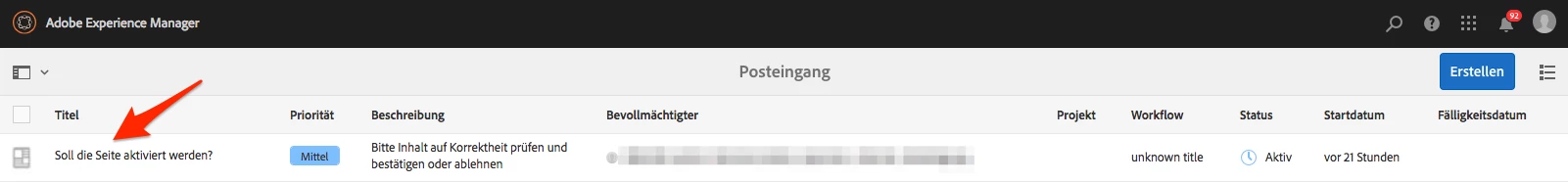 In the inbox screen (/aem/inbox) of AEM 6.4, only the title of the workflow item is visible.