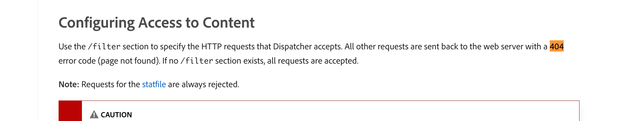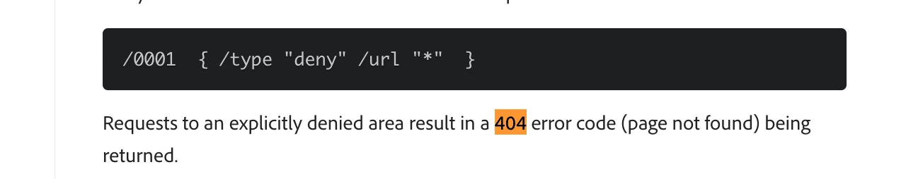 The dispatcher module for Adobe Experience Manager (AEM) uses the /filter setting to define which URLs should be allowed or denied. If a URL is explicitly denied in these settings, the dispatcher returns a 403 (forbiden) as we might think, but really it returns 404 NOT FOUND status code. This is a security measure to prevent access to restricted resources, ensuring that the denied URLs are not accessible by unauthorized users or requests.