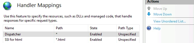From the logs it seems that when IIS handles the request for home.html, the Dispatcher is never asked about "/content/header.html". I thought this is about the order of the two Handler Mappings in IIS: