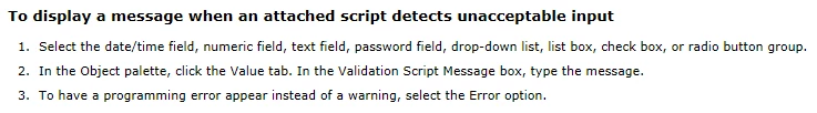 The messages displayed on a text field, however the message will not display on the radio button group. In the Object palette, Value tab I have set the Type: User Entered - Required and in the Empty Message box I wrote the message I want displayed. The radio buttons only have a gray box around them when they are not answered, no display message.