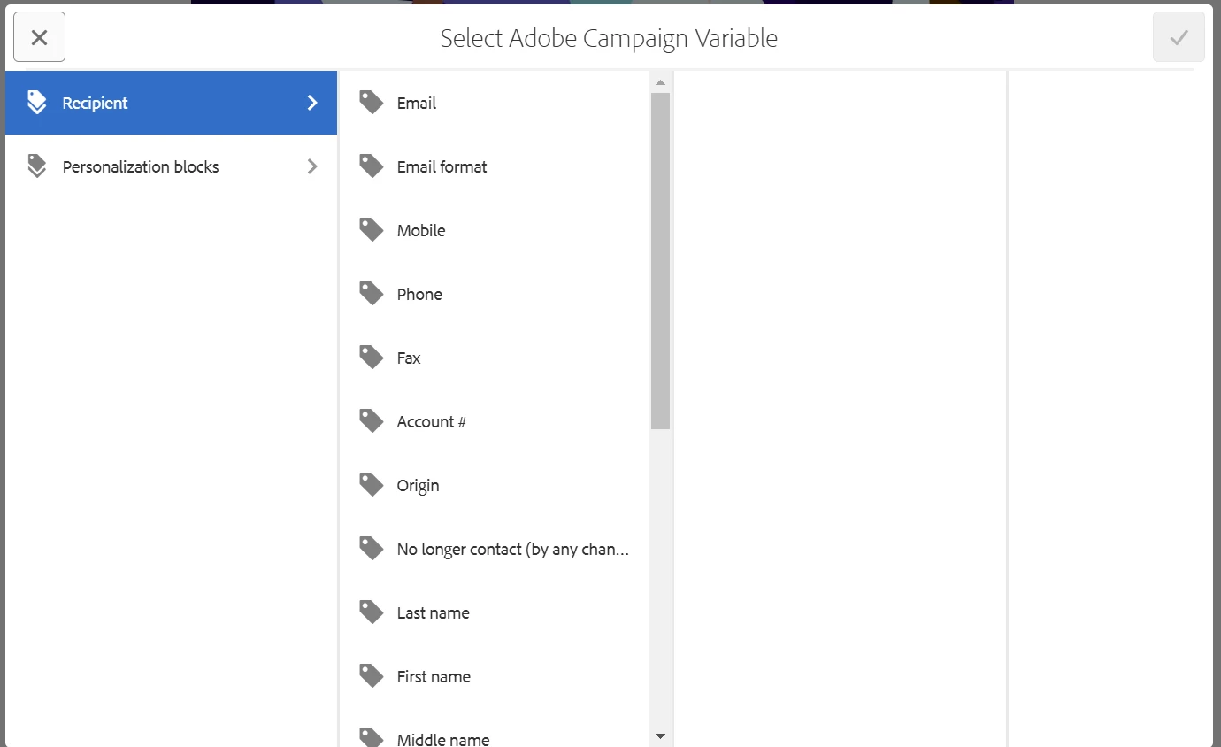 The list of available personalization fields is synchronized with your Adobe Campaign instance. The fields are managed in Adobe Campaign in the schema nms:seedMember. All fields in nms:seedMember must also be present in your recipient table.
