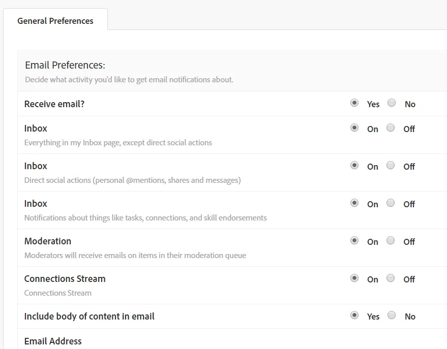 If you're talking about this forum's emails refer - https://forums.adobe.com/user-preferences!input.jspa