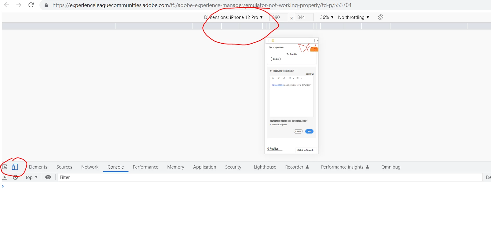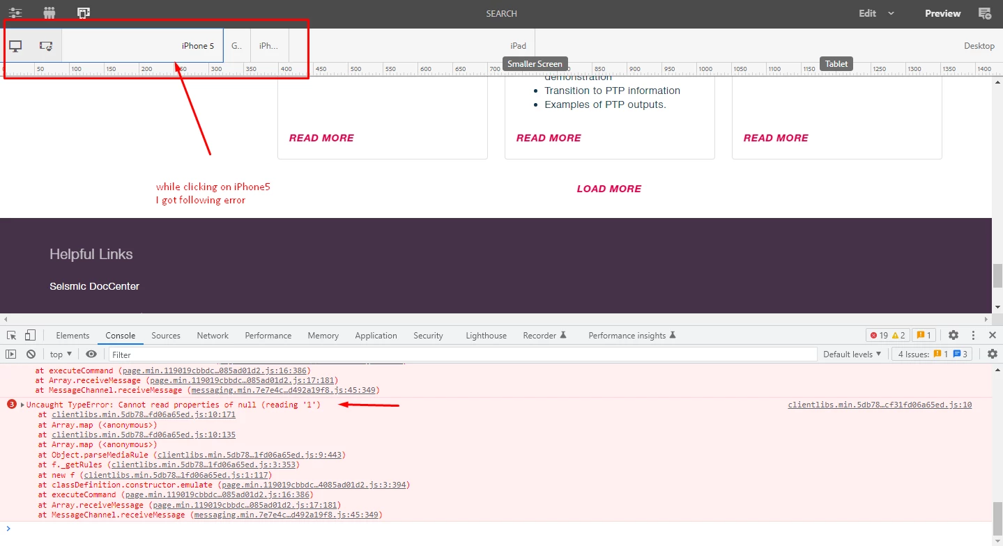 Emulator is not working properly and giving error on console while clicking to change desktop to mobile view.