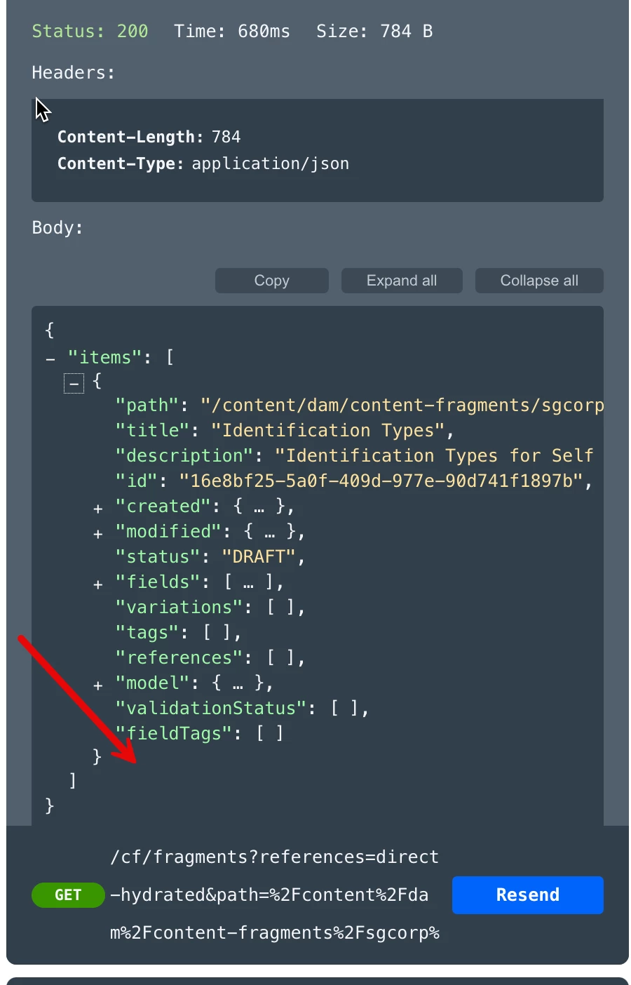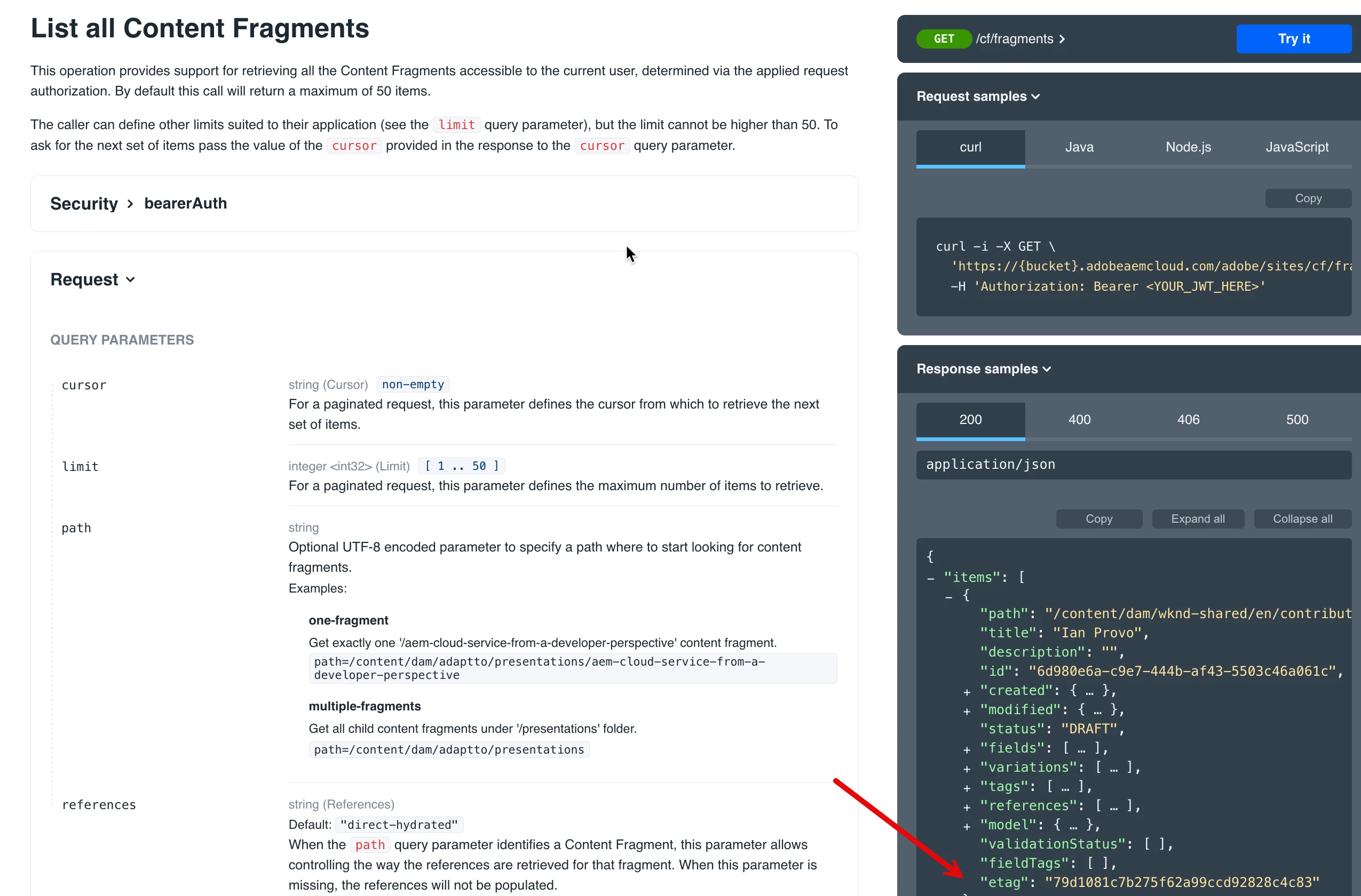 | Use-case: | List Content Fragment documentation reads, API would return `etag`.