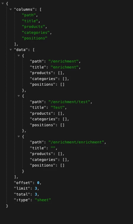 {"columns": ["path","title","products","categories","positions"],"data": [{"path": "/enrichment","title": "enrichment","products": [],"categories": [],"positions": []},{"path": "/enrichment/test","title": "Test","products": [],"categories": [],"positions": []},{"path": "/enrichment/enrichment","title": "","products": [],"categories": [],"positions": []}],"offset": 0,"limit": 3,"total": 3,":type": "sheet"}