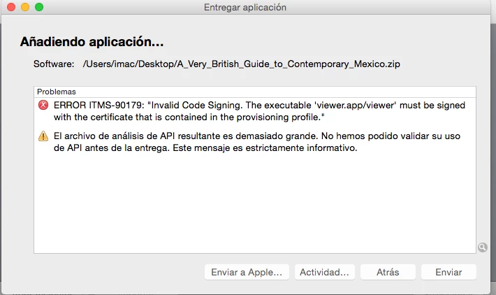 What does "Invalid Code Signing. The executable 'viewer.app/viewer' must be signed with the certificate that is contained in the provisioning profile." means?