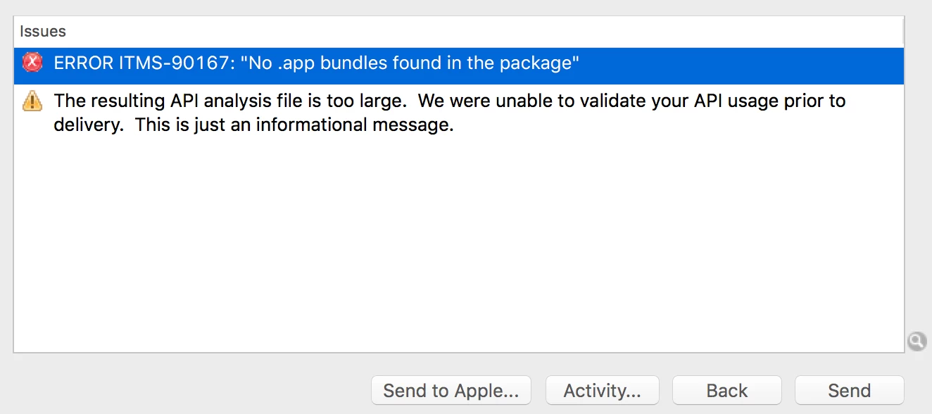 Error ITMS-90167: "No .app bundles found in the package"