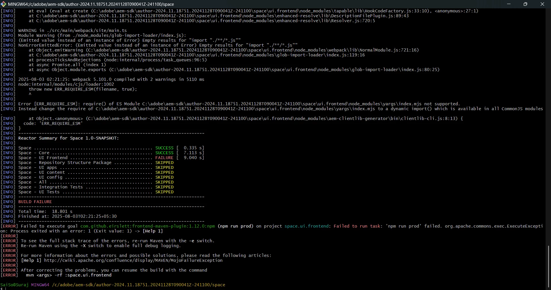 I'm encountering an issue while building my AEM project using the AEM SDK (cloud version). I followed all the steps as per the documentation, but the build keeps failing at the ui.frontend module.