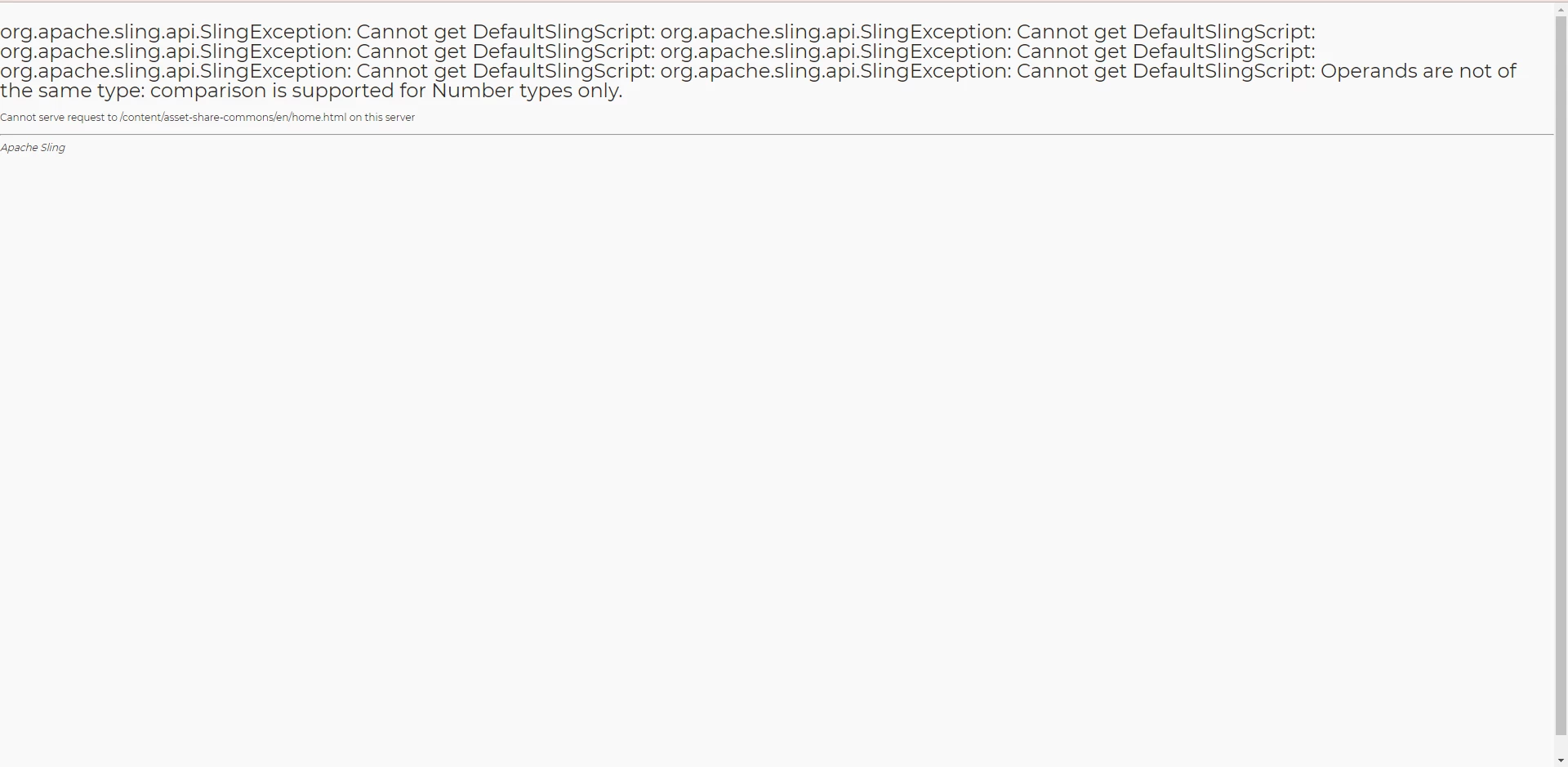 Caused by: org.apache.sling.api.SlingException: Cannot get DefaultSlingScript: org.apache.sling.api.SlingException: Cannot get DefaultSlingScript: org.apache.sling.api.SlingException: Cannot get DefaultSlingScript: org.apache.sling.api.SlingException: Cannot get DefaultSlingScript: Operands are not of the same type: comparison is supported for Number types only. at org.apache.sling.scripting.core.impl.DefaultSlingScript.service(DefaultSlingScript.java:510) at org.apache.sling.engine.impl.request.RequestData.service(RequestData.java:574) at org.apache.sling.engine.impl.filter.SlingComponentFilterChain.render(SlingComponentFilterChain.java:45) at org.apache.sling.engine.impl.filter.AbstractSlingFilterChain.doFilter(AbstractSlingFilterChain.java:88) at com.day.cq.wcm.core.impl.WCMDeveloperModeFilter.doFilter(WCMDeveloperModeFilter.java:119) at org.apache.sling.engine.impl.filter.AbstractSlingFilterChain.doFilter(AbstractSlingFilterChain.java:78) at com.day.cq.wcm.core.impl.WCMDebugFilter.doFilter(WCMDebugFilter.java:138) at org.apache.sling.engine.impl.filter.AbstractSlingFilterChain.doFilter(AbstractSlingFilterChain.java:78) at com.day.cq.wcm.core.impl.WCMComponentFilter.doFilter(WCMComponentFilter.java:278) at org.apache.sling.engine.impl.filter.AbstractSlingFilterChain.doFilter(AbstractSlingFilterChain.java:78) at com.day.cq.wcm.core.impl.page.PageLockFilter.doFilter(PageLockFilter.java:91) at org.apache.sling.engine.impl.filter.AbstractSlingFilterChain.doFilter(AbstractSlingFilterChain.java:78) at com.day.cq.personalization.impl.TargetComponentFilter.doFilter(TargetComponentFilter.java:94) at org.apache.sling.engine.impl.filter.AbstractSlingFilterChain.doFilter(AbstractSlingFilterChain.java:78) at com.adobe.granite.csrf.impl.CSRFFilter.doFilter(CSRFFilter.java:217) [com.adobe.granite.csrf:1.0.20.CQ650-B0002] at org.apache.sling.engine.impl.filter.AbstractSlingFilterChain.doFilter(AbstractSlingFilterChain.java:78) at org.apache.sling.engine.impl.SlingRequestProcessorImpl.processComponent(SlingRequestProcessorImpl.java:283) at org.apache.sling.engine.impl.SlingRequestProcessorImpl.dispatchRequest(SlingRequestProcessorImpl.java:323) at org.apache.sling.engine.impl.request.SlingRequestDispatcher.dispatch(SlingRequestDispatcher.java:211) at org.apache.sling.engine.impl.request.SlingRequestDispatcher.include(SlingRequestDispatcher.java:104) at com.day.cq.wcm.core.impl.WCMComponentFilter$ForwardRequestDispatcher.include(WCMComponentFilter.java:516) at com.adobe.cq.sightly.WCMScriptHelper.includeResource(WCMScriptHelper.java:179) [com.adobe.cq.sightly.cq-wcm-sightly-extension:1.6.0] ... 207 common frames omitted Caused by: org.apache.sling.scripting.sightly.SightlyException: org.apache.sling.api.SlingException: Cannot get DefaultSlingScript: org.apache.sling.api.SlingException: Cannot get DefaultSlingScript: org.apache.sling.api.SlingException: Cannot get DefaultSlingScript: Operands are not of the same type: comparison is supported for Number types only. at com.adobe.cq.sightly.WCMScriptHelper.includeResource(WCMScriptHelper.java:184) [com.adobe.cq.sightly.cq-wcm-sightly-extension:1.6.0] at com.adobe.cq.sightly.internal.extensions.ResourceExtension.call(ResourceExtension.java:138) [com.adobe.cq.sightly.cq-wcm-sightly-extension:1.6.0] at org.apache.sling.scripting.sightly.impl.engine.runtime.RenderContextImpl.call(RenderContextImpl.java:77) [org.apache.sling.scripting.sightly:1.1.2.1_4_0] at org.apache.sling.scripting.sightly.libs.wcm.foundation.components.responsivegrid.responsivegrid_html.render(responsivegrid_html.java:119) at org.apache.sling.scripting.sightly.render.RenderUnit.render(RenderUnit.java:50) [org.apache.sling.scripting.sightly.runtime:1.1.0.1_4_0] at org.apache.sling.scripting.sightly.impl.engine.SightlyCompiledScript.eval(SightlyCompiledScript.java:60) [org.apache.sling.scripting.sightly:1.1.2.1_4_0] at org.apache.sling.scripting.core.impl.DefaultSlingScript.call(DefaultSlingScript.java:386) at org.apache.sling.scripting.core.impl.DefaultSlingScript.eval(DefaultSlingScript.java:184) at org.apache.sling.scripting.core.impl.DefaultSlingScript.service(DefaultSlingScript.java:491) ... 228 common frames omitted Caused by: org.apache.sling.api.SlingException: Cannot get DefaultSlingScript: org.apache.sling.api.SlingException: Cannot get DefaultSlingScript: org.apache.sling.api.SlingException: Cannot get DefaultSlingScript: Operands are not of the same type: comparison is supported for Number types only. at org.apache.sling.scripting.core.impl.DefaultSlingScript.service(DefaultSlingScript.java:510) at org.apache.sling.engine.impl.request.RequestData.service(RequestData.java:574) at org.apache.sling.engine.impl.filter.SlingComponentFilterChain.render(SlingComponentFilterChain.java:45) at org.apache.sling.engine.impl.filter.AbstractSlingFilterChain.doFilter(AbstractSlingFilterChain.java:88) at com.day.cq.wcm.core.impl.WCMDeveloperModeFilter.doFilter(WCMDeveloperModeFilter.java:119) at org.apache.sling.engine.impl.filter.AbstractSlingFilterChain.doFilter(AbstractSlingFilterChain.java:78) at com.day.cq.wcm.core.impl.WCMDebugFilter.doFilter(WCMDebugFilter.java:138) at org.apache.sling.engine.impl.filter.AbstractSlingFilterChain.doFilter(AbstractSlingFilterChain.java:78) at com.day.cq.wcm.core.impl.WCMComponentFilter.doFilter(WCMComponentFilter.java:278) at org.apache.sling.engine.impl.filter.AbstractSlingFilterChain.doFilter(AbstractSlingFilterChain.java:78) at com.day.cq.wcm.core.impl.page.PageLockFilter.doFilter(PageLockFilter.java:91) at org.apache.sling.engine.impl.filter.AbstractSlingFilterChain.doFilter(AbstractSlingFilterChain.java:78) at com.day.cq.personalization.impl.TargetComponentFilter.doFilter(TargetComponentFilter.java:94) at org.apache.sling.engine.impl.filter.AbstractSlingFilterChain.doFilter(AbstractSlingFilterChain.java:78) at com.adobe.granite.csrf.impl.CSRFFilter.doFilter(CSRFFilter.java:217) [com.adobe.granite.csrf:1.0.20.CQ650-B0002] at org.apache.sling.engine.impl.