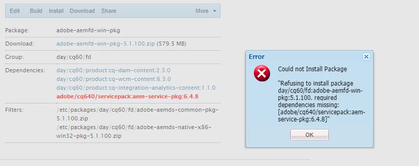 Error: "Refusing to install package day/cq60/fd:adobe-aemfd-win-pkg:5.1.100. required dependencies missing: [adobe/cq640/servicepack:aem-service-pkg:6.4.8]"