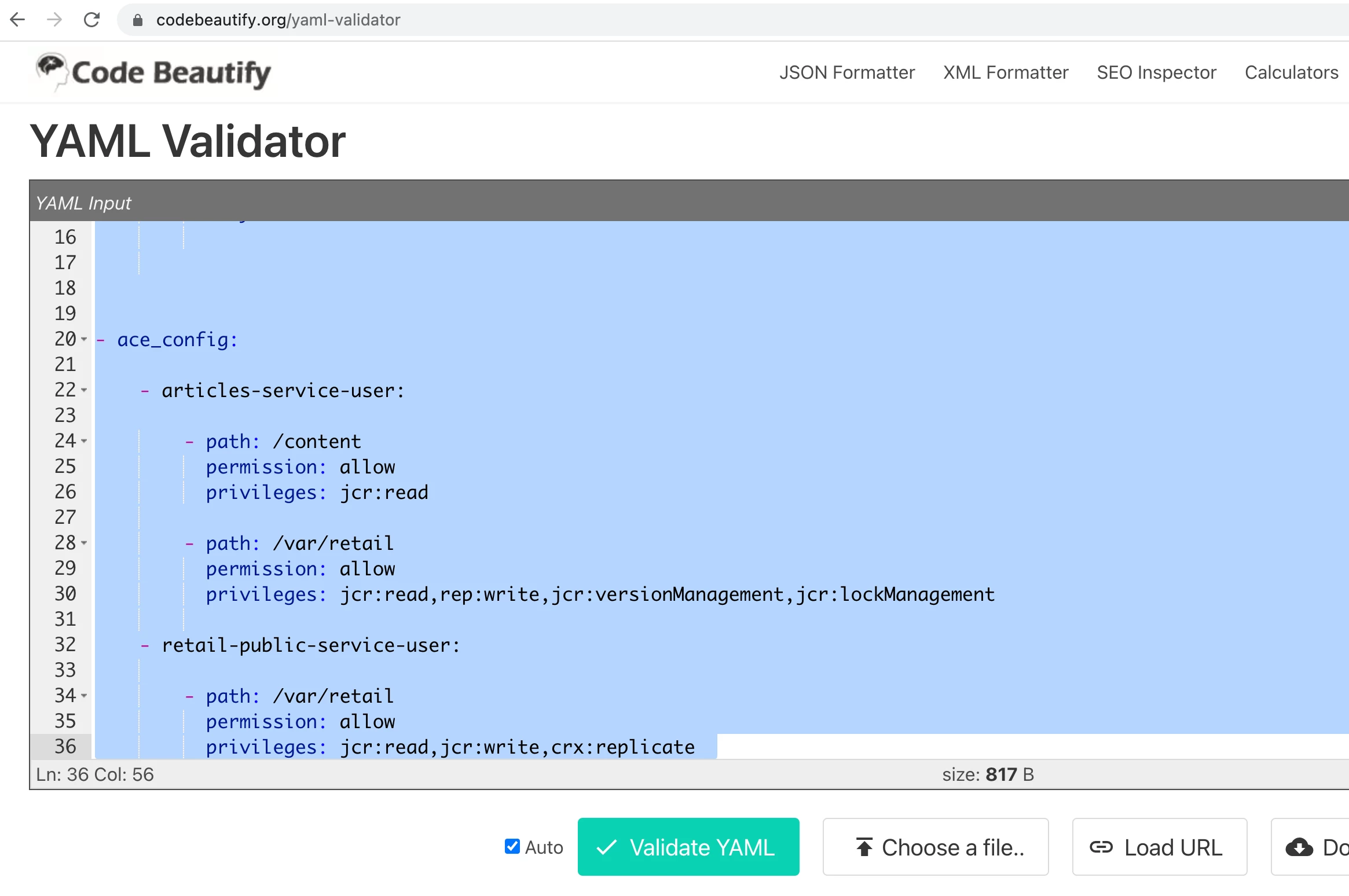*ERROR* [OsgiInstallerImpl] biz.netcentric.cq.tools.actool.installhook.AcToolInstallHook Exception during execution of install hook: java.lang.IllegalArgumentException: Invalid yaml source file /jcr_root/apps/infra-core/acl-config/retail/config.ret/service-users.yaml: while parsing a block mapping\n in 'string', line 20, column 7:\n - articles-service-user:\n