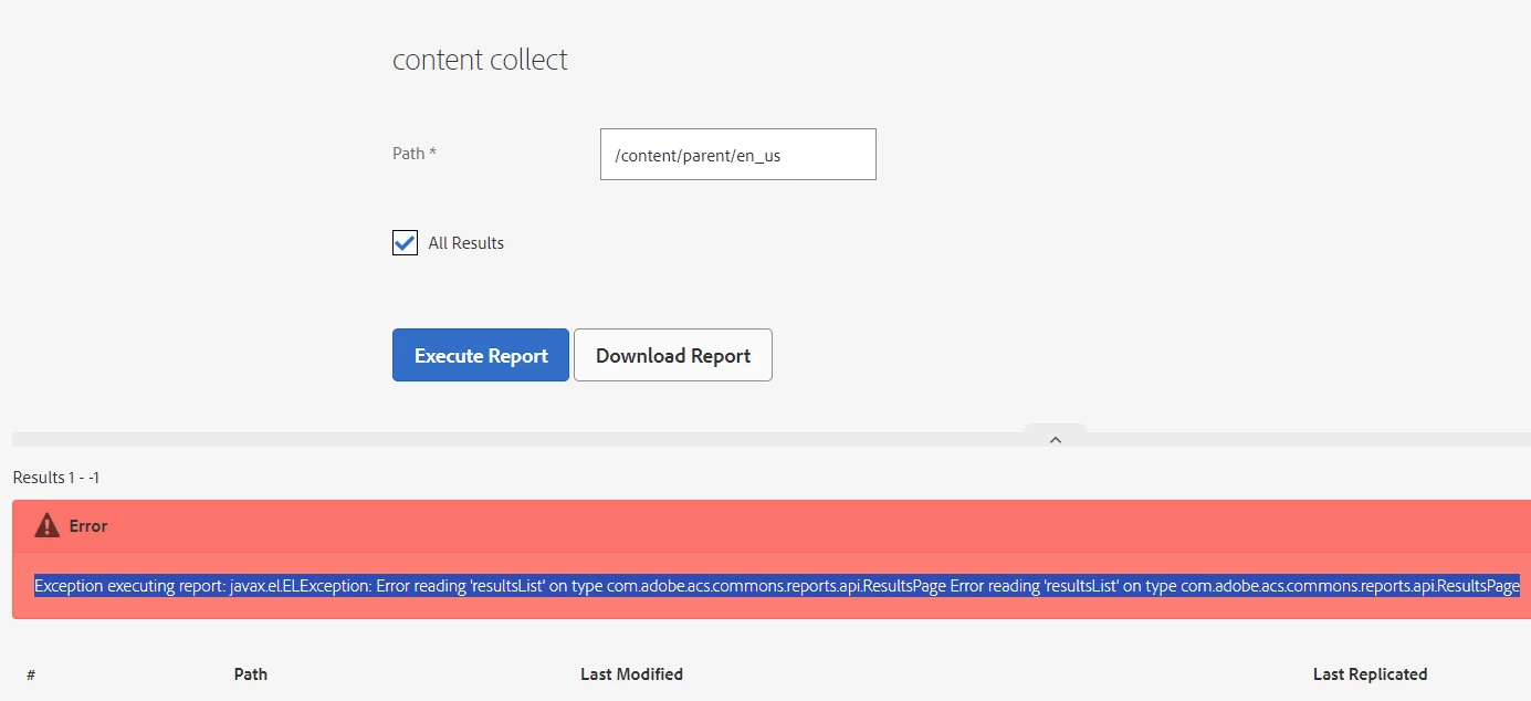 Error: Exception executing report: javax.el.ELException: Error reading 'resultsList' on type com.adobe.acs.commons.reports.api.ResultsPage Error reading 'resultsList' on type com.adobe.acs.commons.reports.api.ResultsPage
