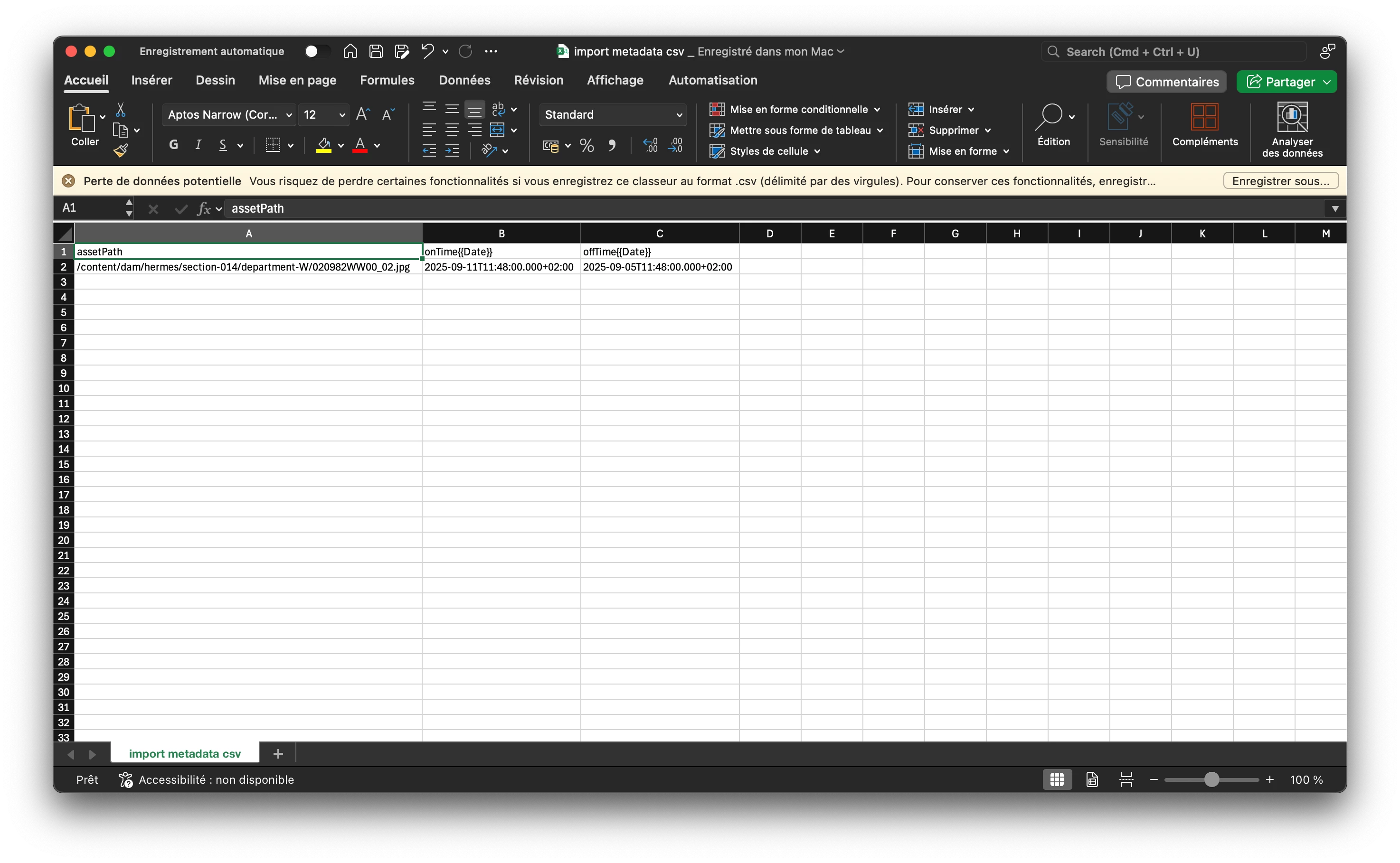 | Use-case: | Contributors need to export assets metadata which are on the jcr:content node like onTime or offTime, then modify these values and update them massively in the dam |