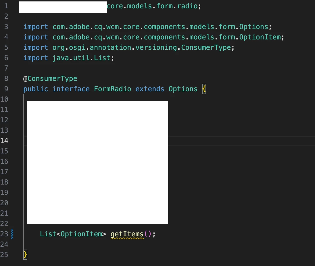 seems you are return something.core.models.form.radio.OptionItem instead of com.adobe.cq.wcm.core.components.models.form.OptionItem