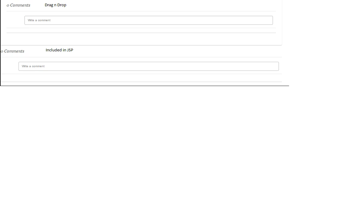 I am trying to extend the comments component. I used the sample package available on this link. After installing the package I am able to make comments from publish side. But this seems to happen only if I drop the component, but if I include the component in my custom site's page jsp, the component is not rendered fine. I compared the node structure and it matches with one mentioned on this link. After I drop same custom comments component on same page, the included custom component also starts working fine. I am also adding the 'Client Libs List' component so that the JS works fine. I have attached images showing how the components look when included and when DnD'd and included (The CSS was disabled).