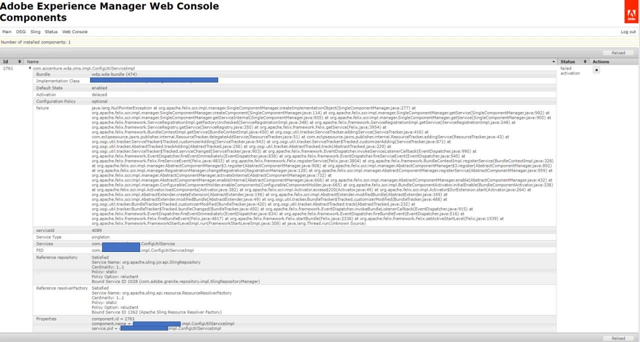 Failed customized components after upgrading (org.osgi.framework.ServiceException: Service factory returned null.)