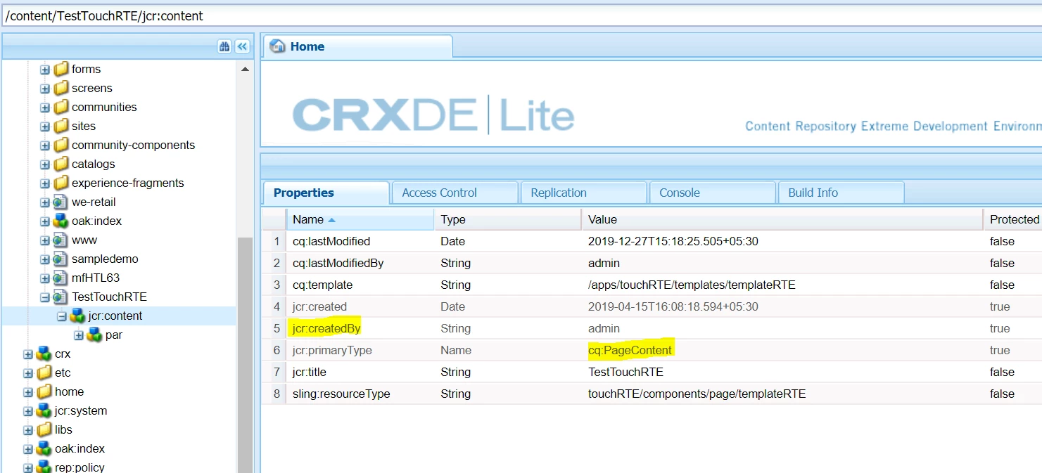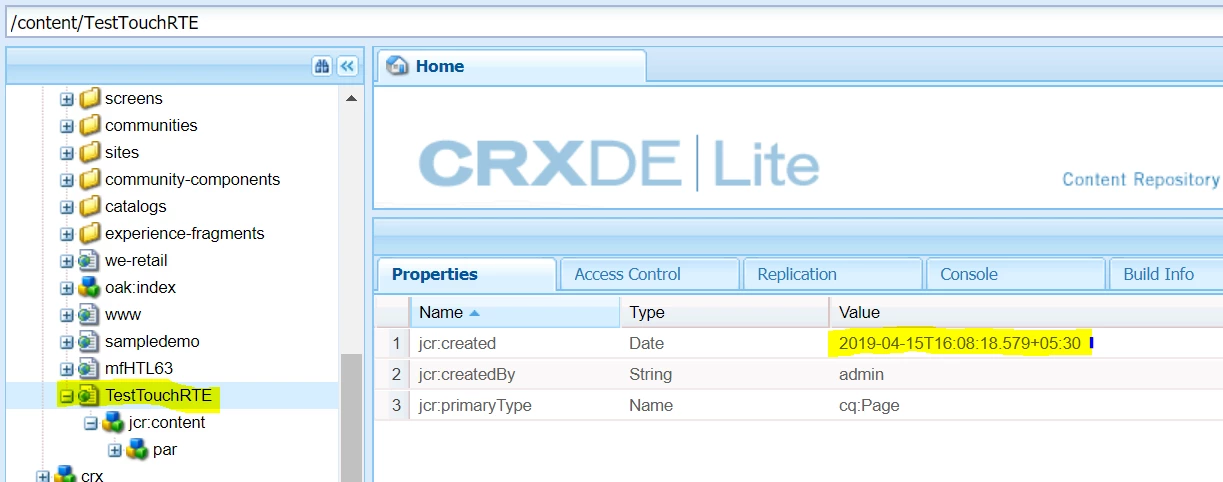 We need to fetch the jcr:created date for cq:Page (TestTouchRTE).