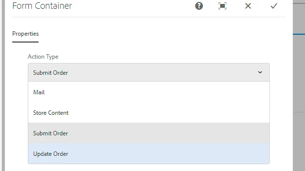 Want to understand the Form action types provided in core Form container component. Actions Types of Mail & Store Content functionality have try them. Can anyone let me know functionalities in action types drop-down i.e. Submit & Update order. What those action types does and how to implement ?