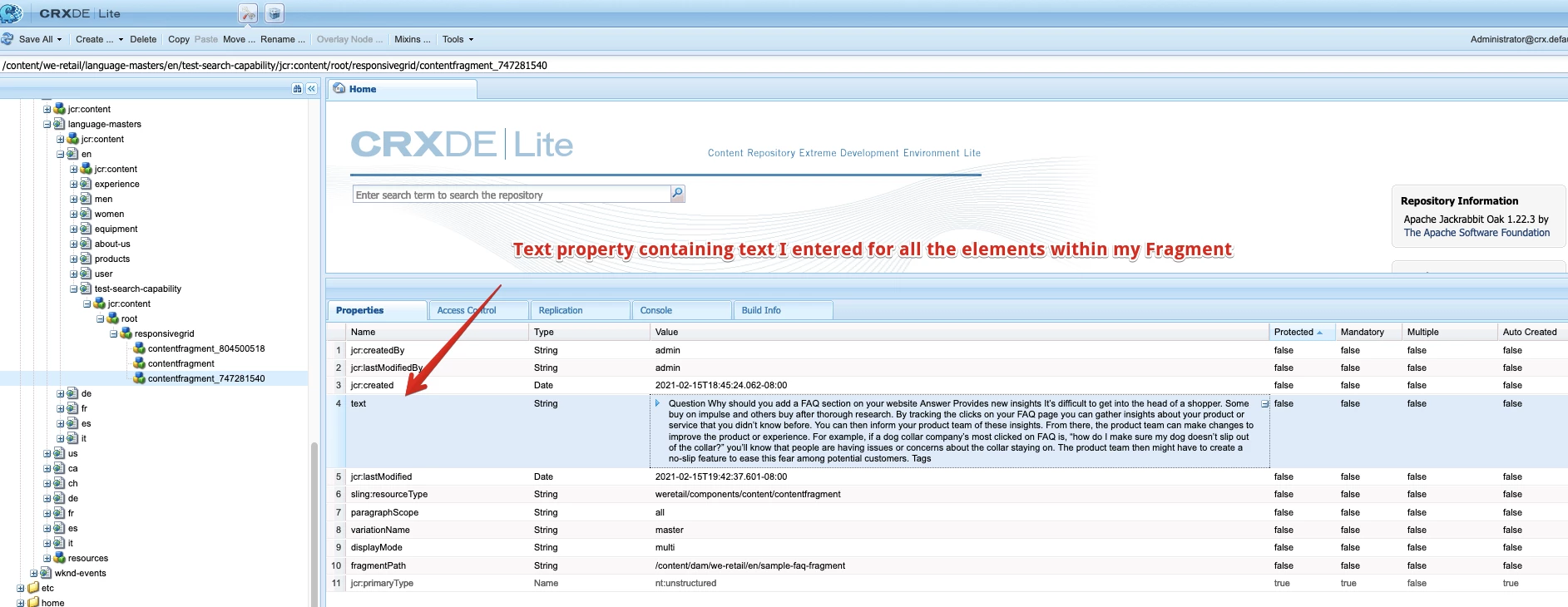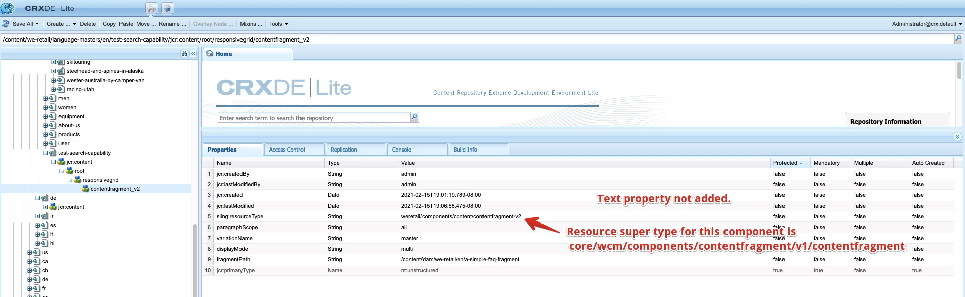 - Now when we add a content fragment component onto a page, it does not add a "text" property to the content fragment content node