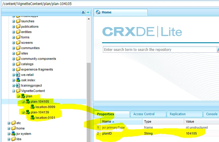 Now my requirement is that I want all the child nodes like plan-104105 , location-9999 etc. with the JCR property Value.I have written below code. But I am not getting.