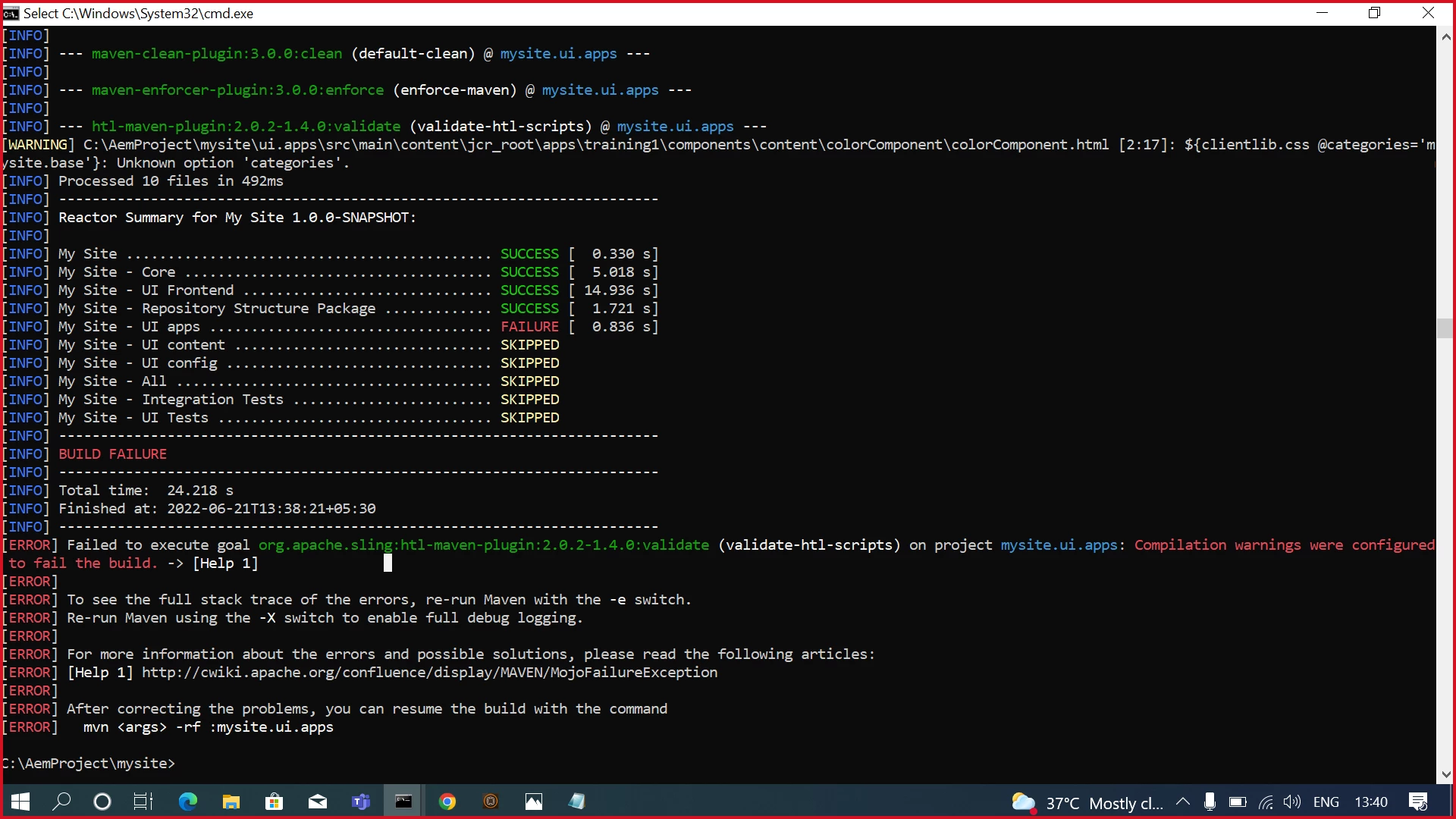 This error appear in the build because of the "failOnWarnings" set as true in the plugin "htl-maven-plugin"