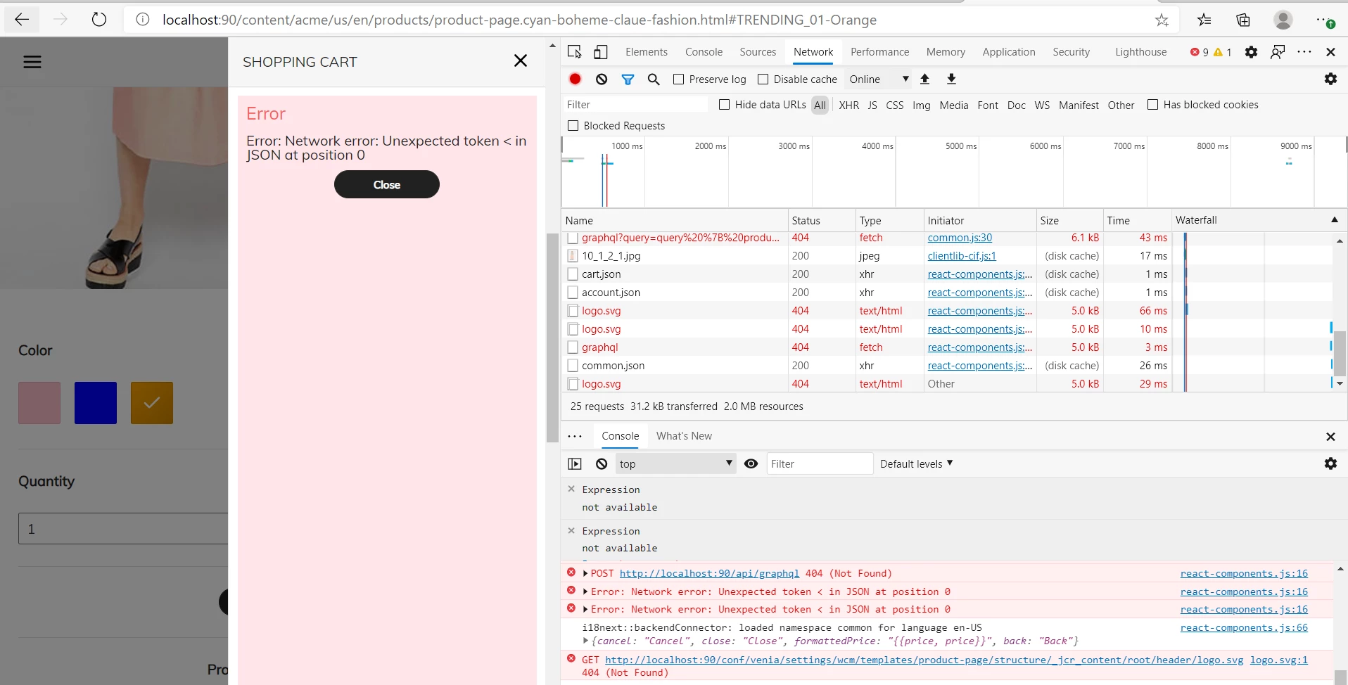 I'm trying to added product in Cart but getting error as "Error: Network error: Unexpected token < in JSON at position 0" and unable to see Product images on web page. I have tried it using IIS server(v10.0) with Dispatcher(v4.3.3) but getting same error. For reference please find attached screenshot.