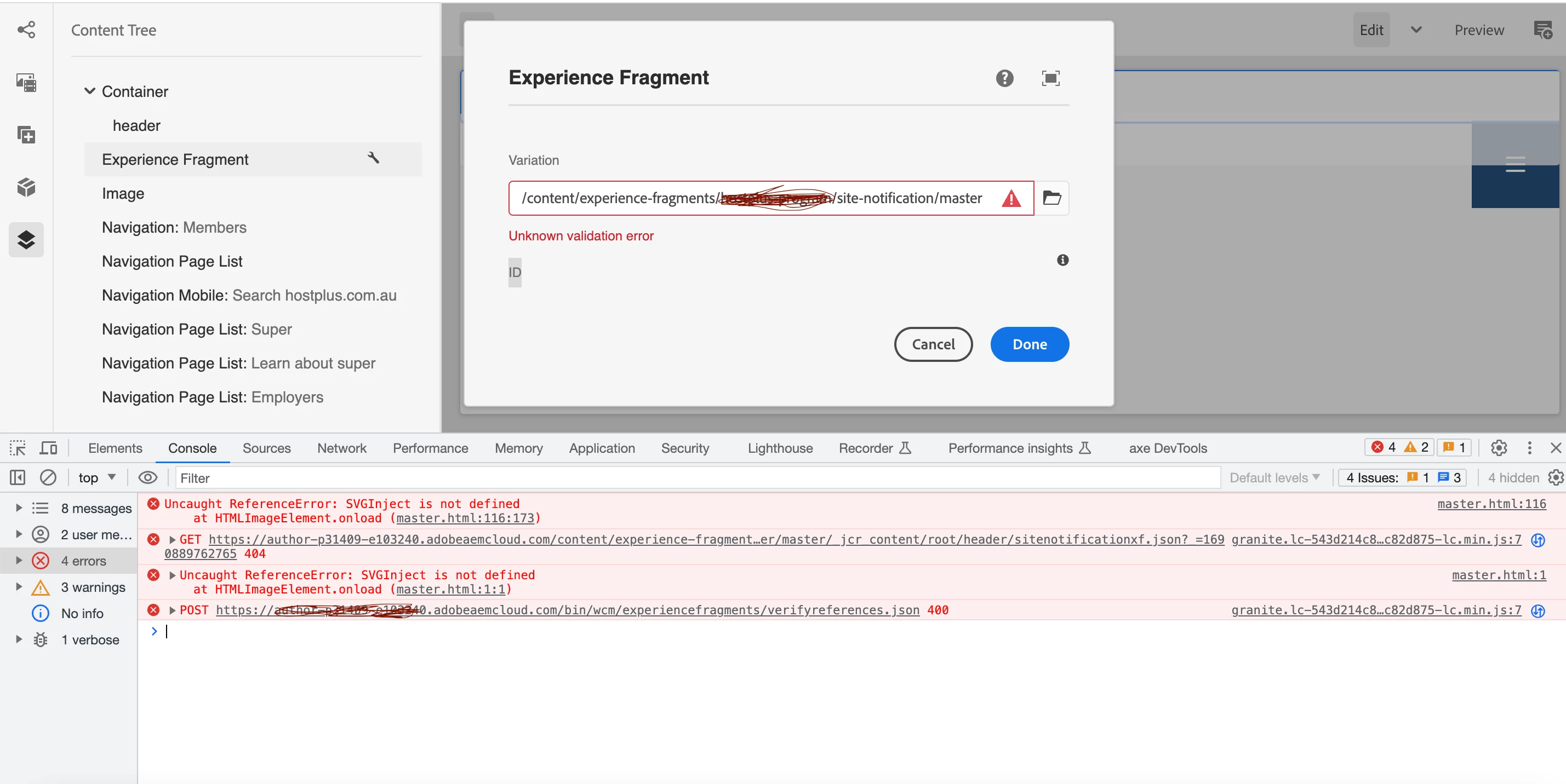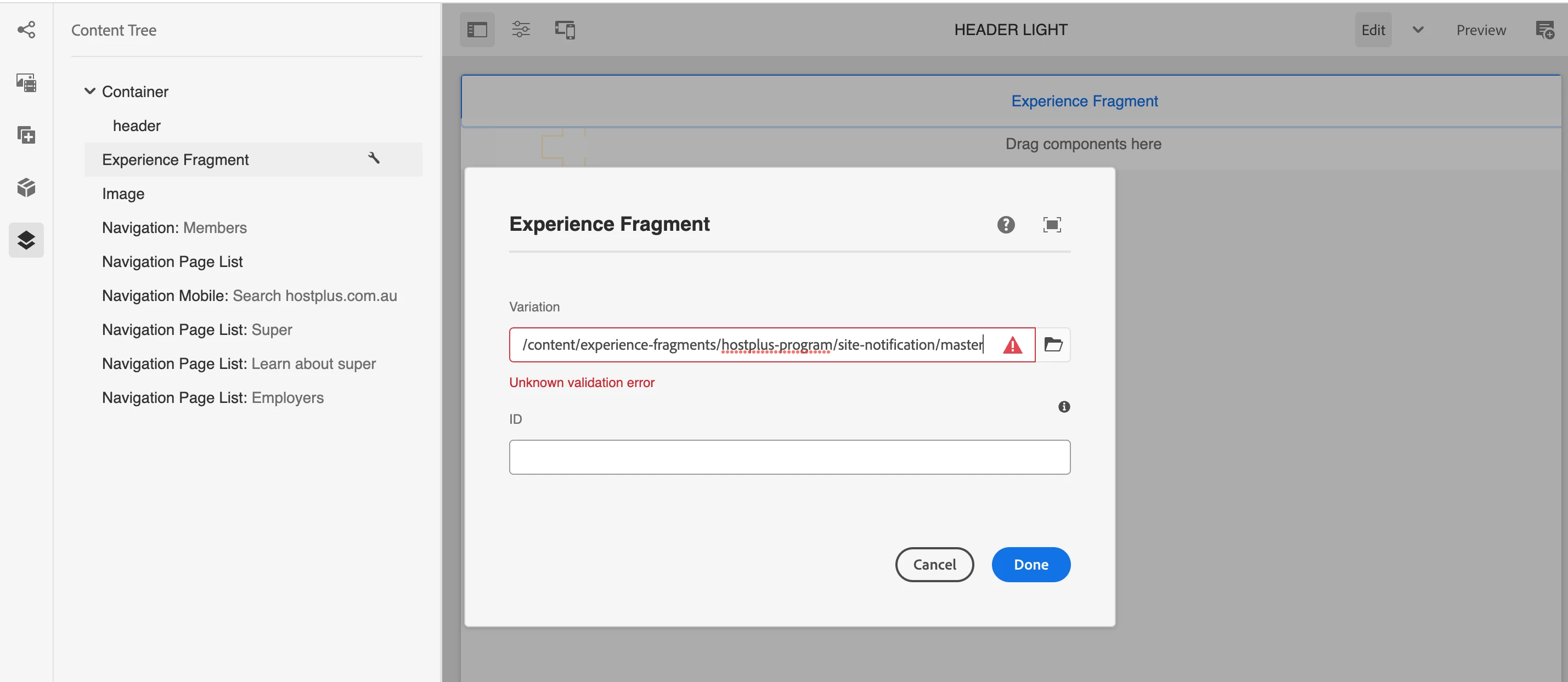 I deployed this code in dev and stage server and there I can author path of notification XF into this experience fragment component but same thing is not working on stage. I am getting Unknown validation error as below