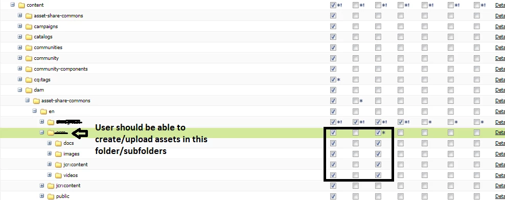 To do this I have given read and create permission to that folder paths as shown below, but I am not able to see the Create button in Assets folder path to be able to upload the assets in the AEM Assets screen.