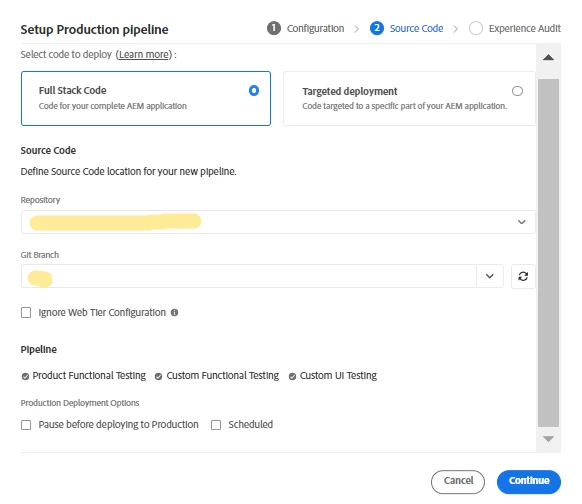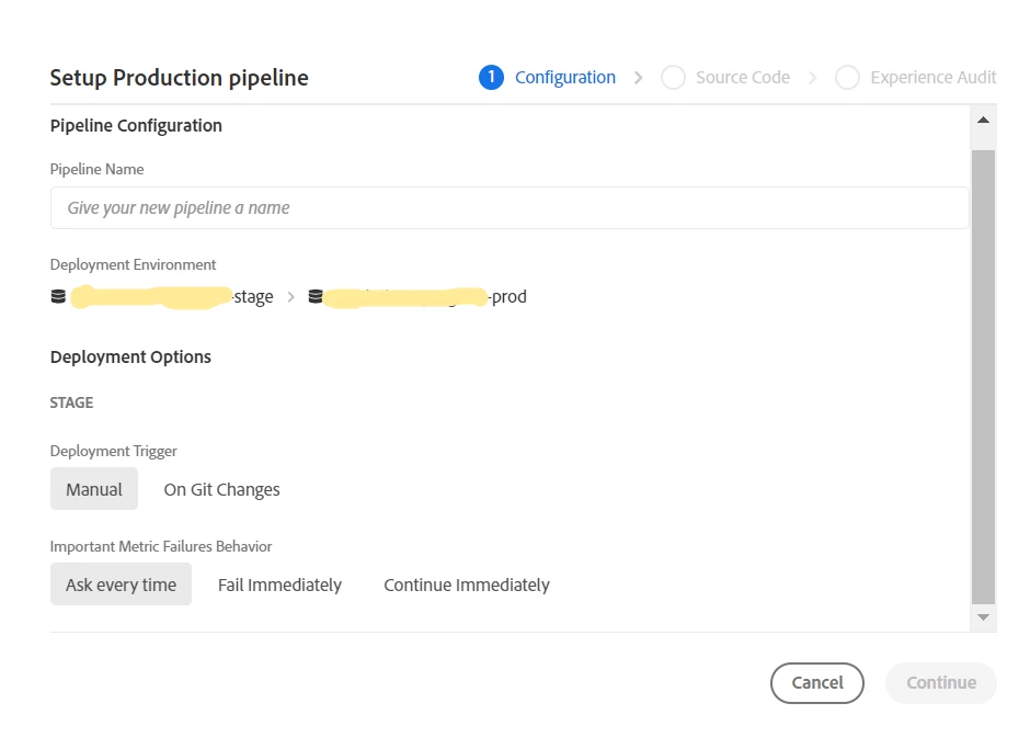 I'm trying to create a Production Pipeline in Cloud Manager.