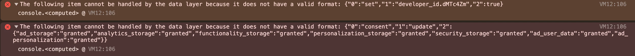 The following item cannot be handled by the data layer because it does not have a valid format: {"0":"js","1":"2024-05-14T22:58:38.589Z"}