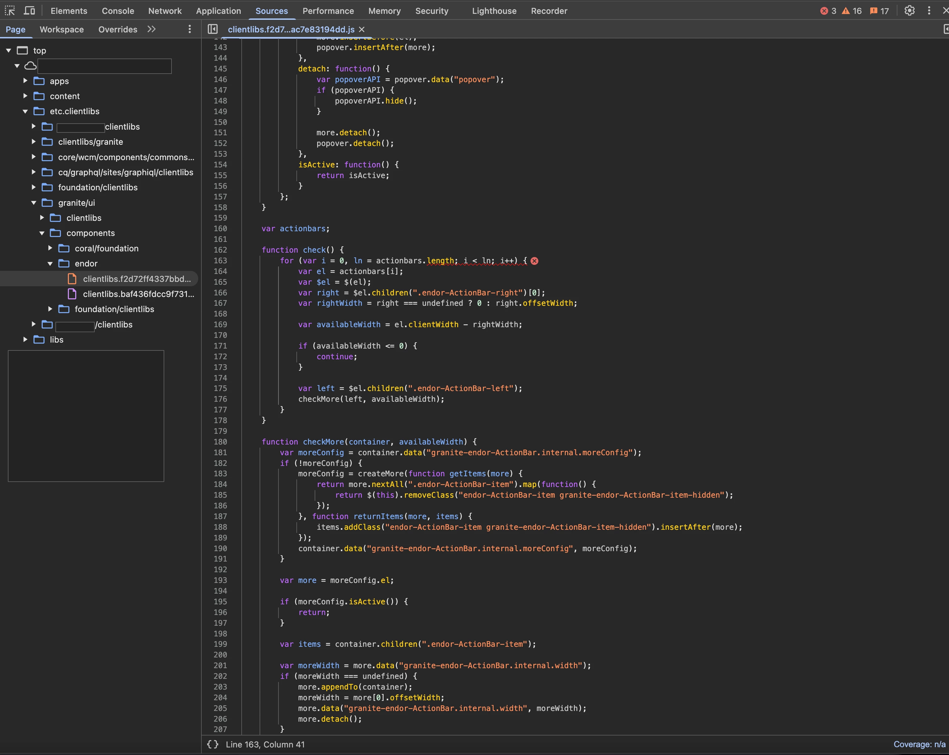 granite/ui/components/endor/actionbarthrowing a console error (see images below), but I cannot find the location where the actionbar could or should be implemented to fix the problem. This error might restrict further execution of JavaScript code on the site so I want to resolve it.
