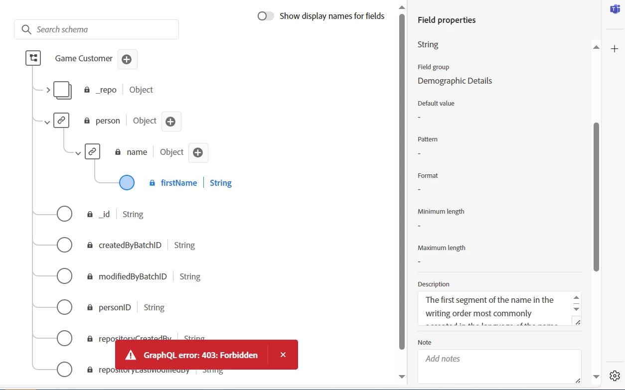 However, the error message of GraphQL error: 403: Forbidden keeps showing on AJO screen. However, I could be able to click the button such as Finish or Save as a trigger to finish the task. I've attached a screenshot for your information.