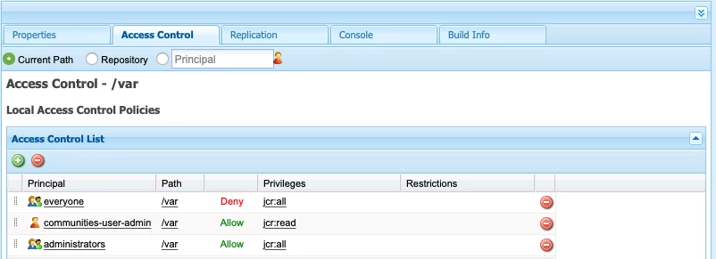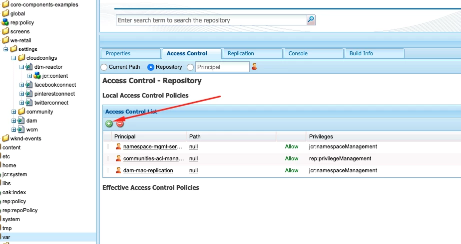 I can't see any groups in the access control list tab of the root node in CRX, which is available in the attached screenshot. I have checked Administrators and Everyone groups in Users page. What to do?
