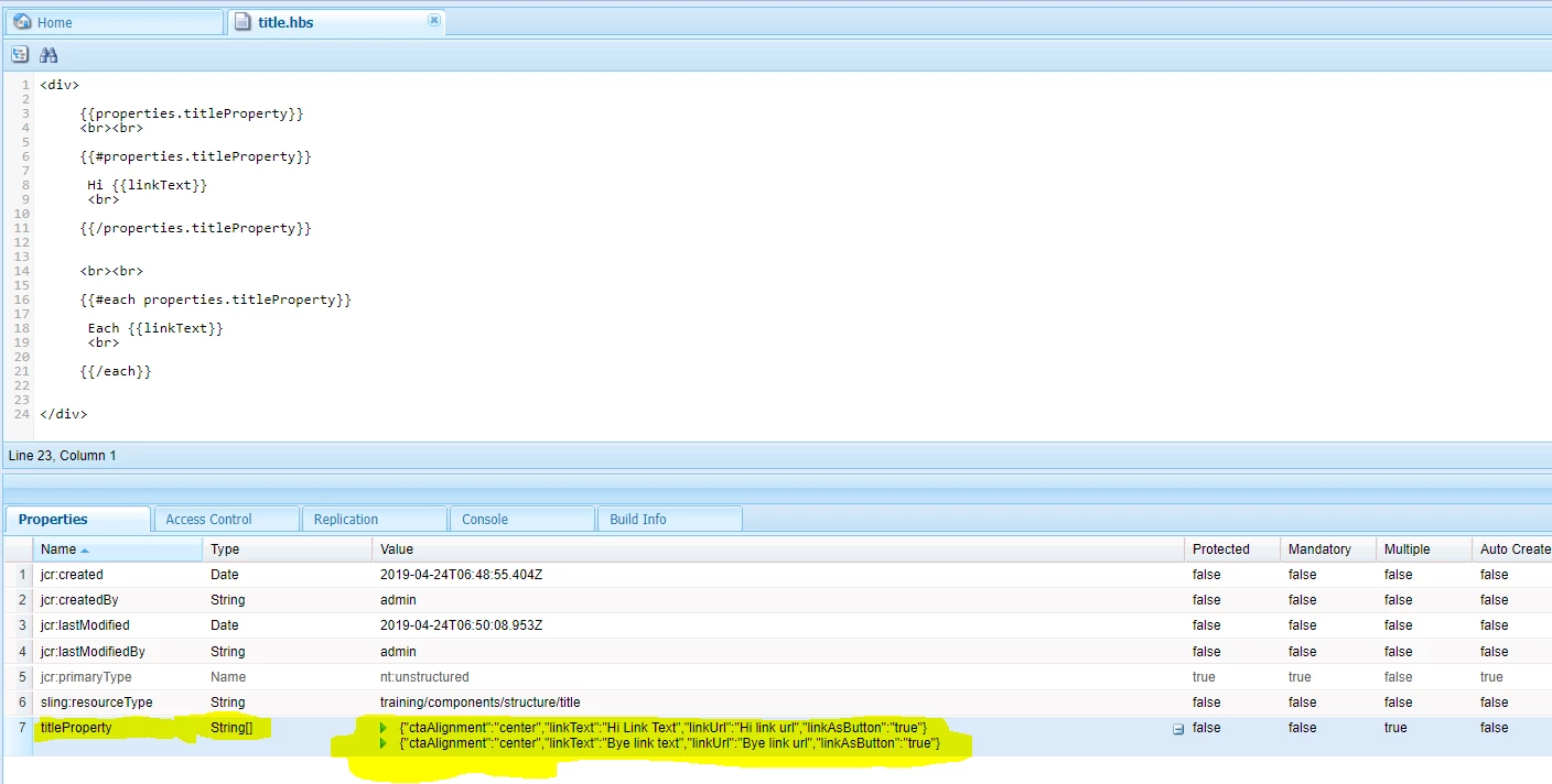 I am new to AEM and facing one strange issue with Handlebars js support in AEM. I have created a simple component with .hbs file. Within hbs file I am simply rendering the JSON array using handlerbars iteration mechanism. It does iterate the array but it does not print the actual value of any of its object element.