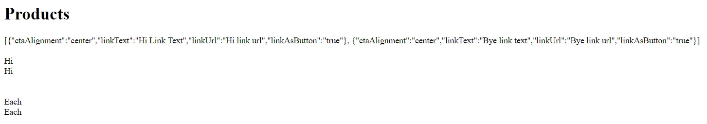 Result of the page rendering. It does not print the value of "linkText". However it does print the whole object using {{this}}.