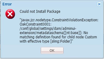 I am using AEM 6.5. I want to configure custom meta data to create additional tab in asset properties. I have a package containing the details of metadata. I am facing problem in installing the package. I also want to highlight that there is no default metadataschema present in /conf/global/settings/dam/adminui-extension/metadataschema. I am facing error following error in installing the package.