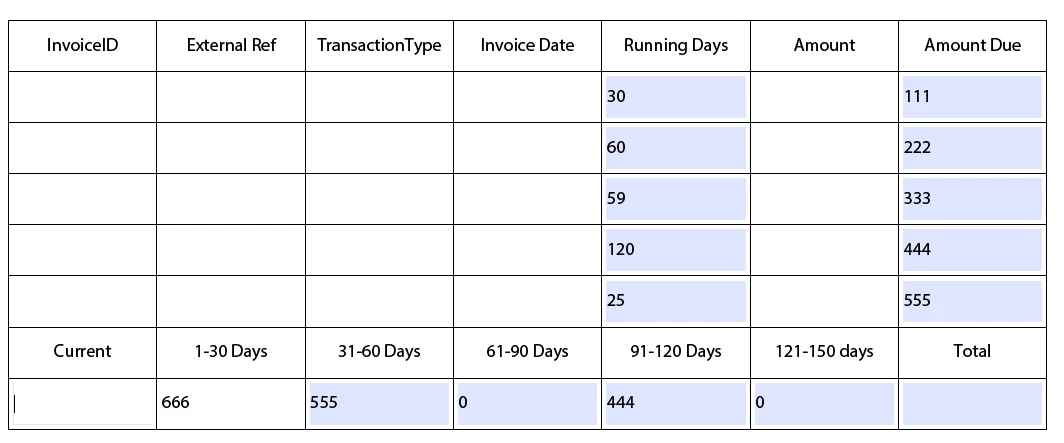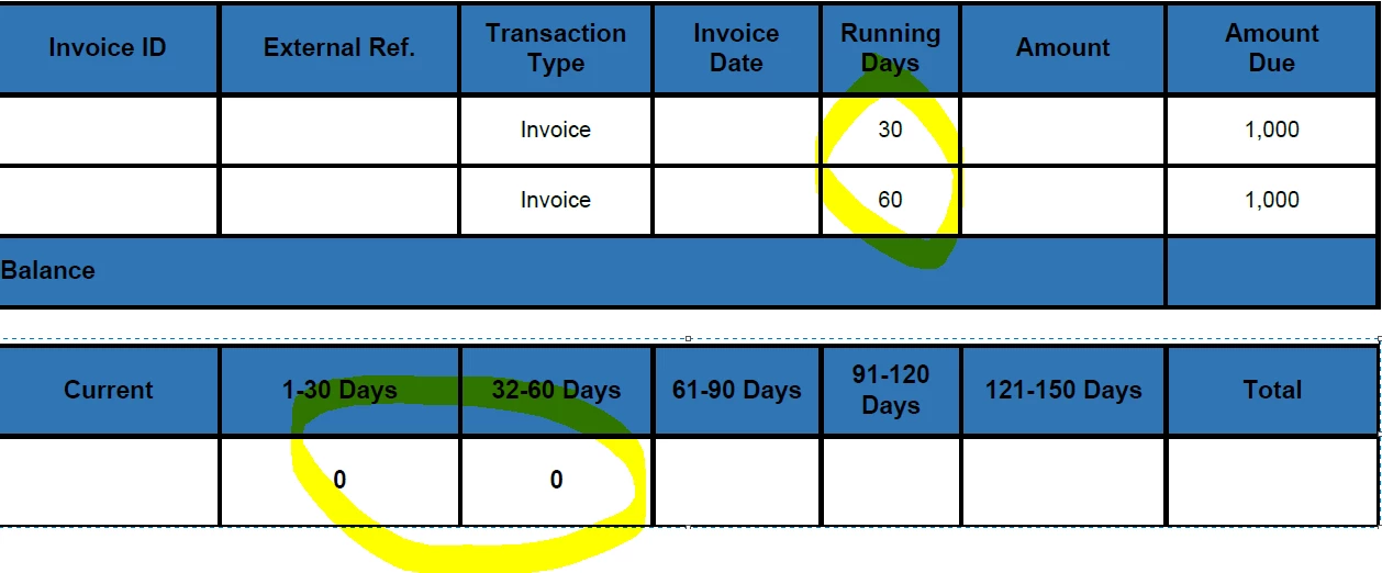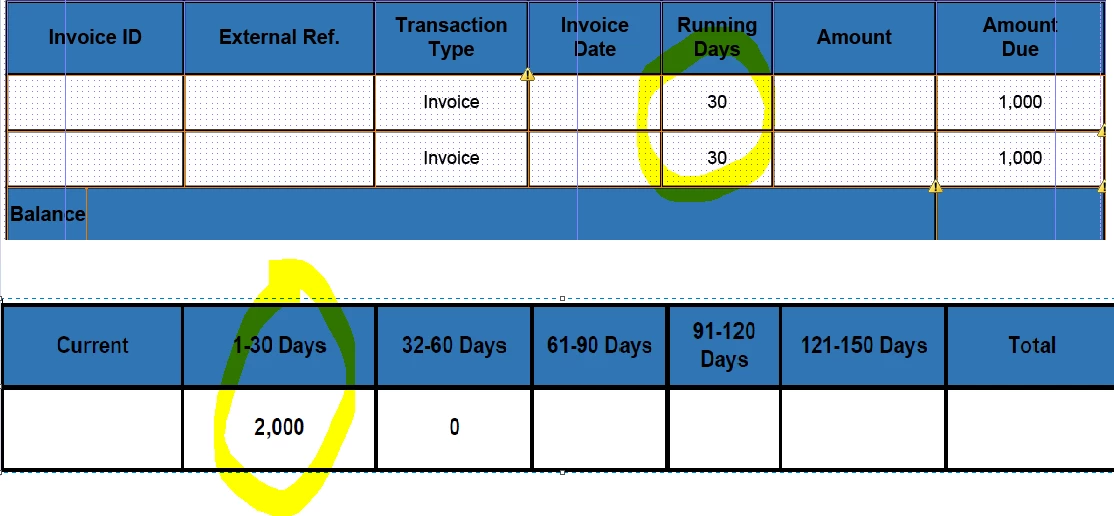 I want to sum up the "Amount Due" if the "Running days" were in line with this scenario.