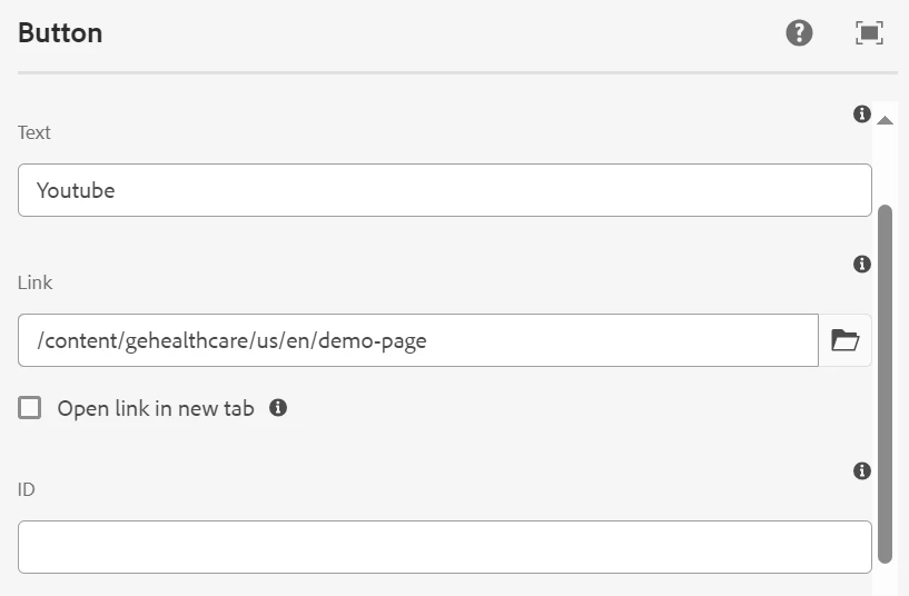 I need to remove the check box from the button component. but in the dialog structure, I didn't see linkTarget filed.I'm using button/v2