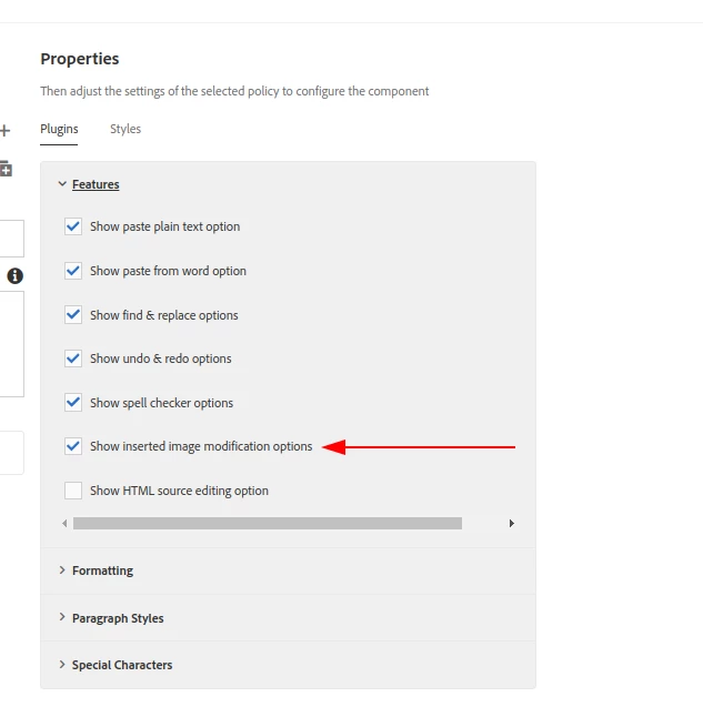 I want to add image upload option on text component. I am adding two propeties for show image upload option in rtePlugin but it's not worked