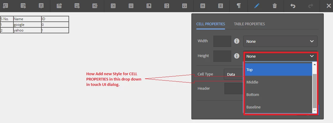 How add new style class for Cell Properties in richtext' table plugin in touch ui dialog